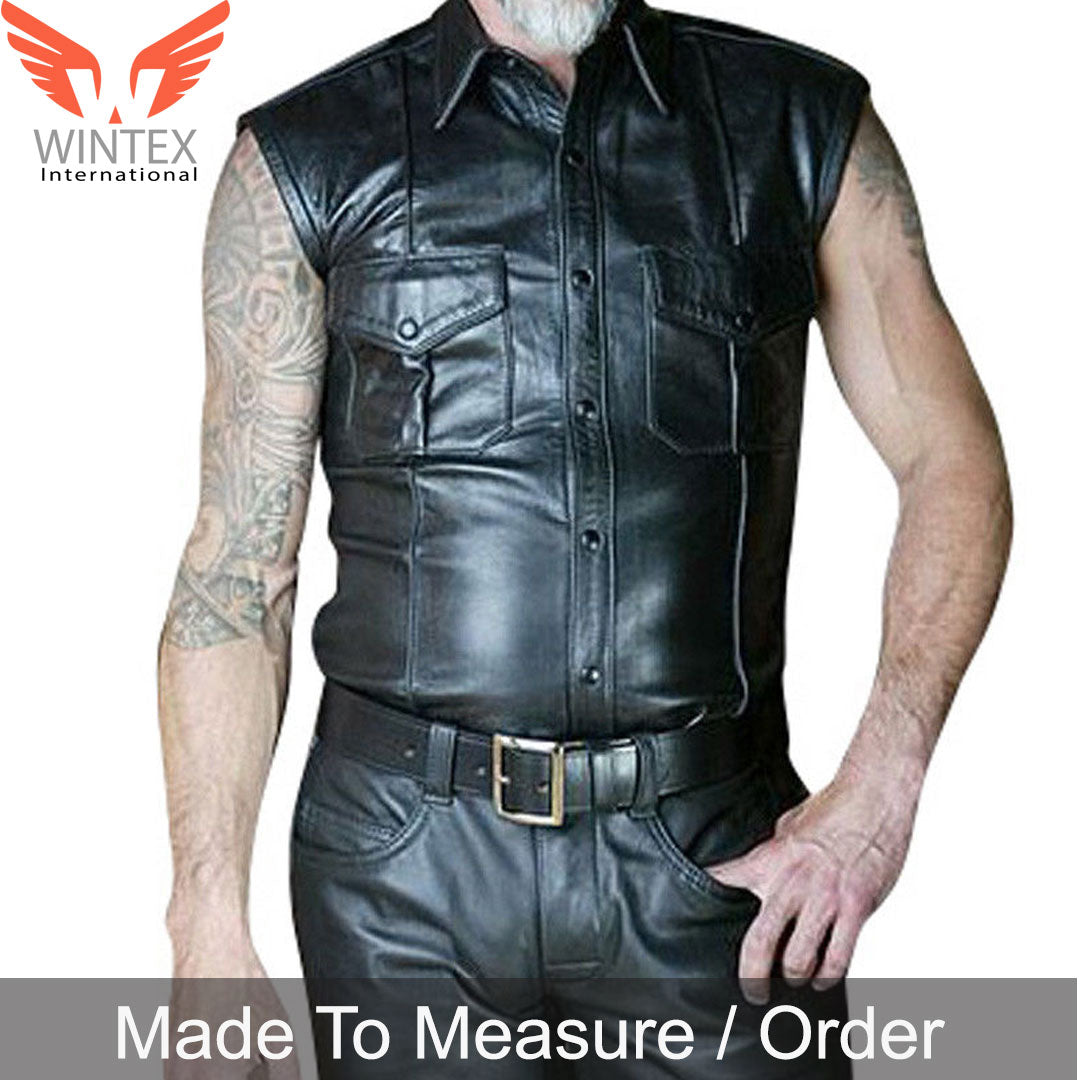 Men’s Real Lamb Leather Police Style Sleeveless Shirt Leather Shirt BLUF Shirt