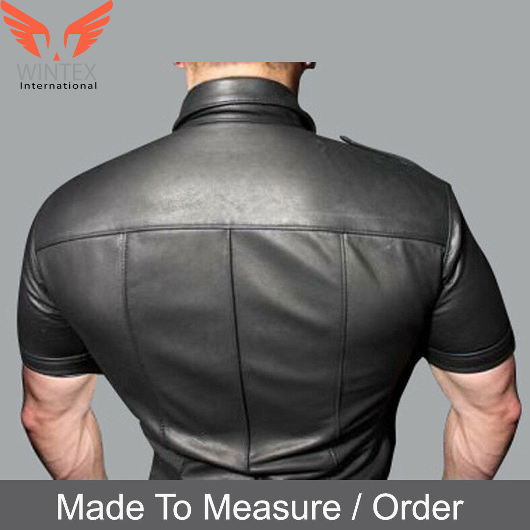 Men’s Real Lamb Leather Police Uniform Shirt Sexy Short Sleeve Leather Shirt