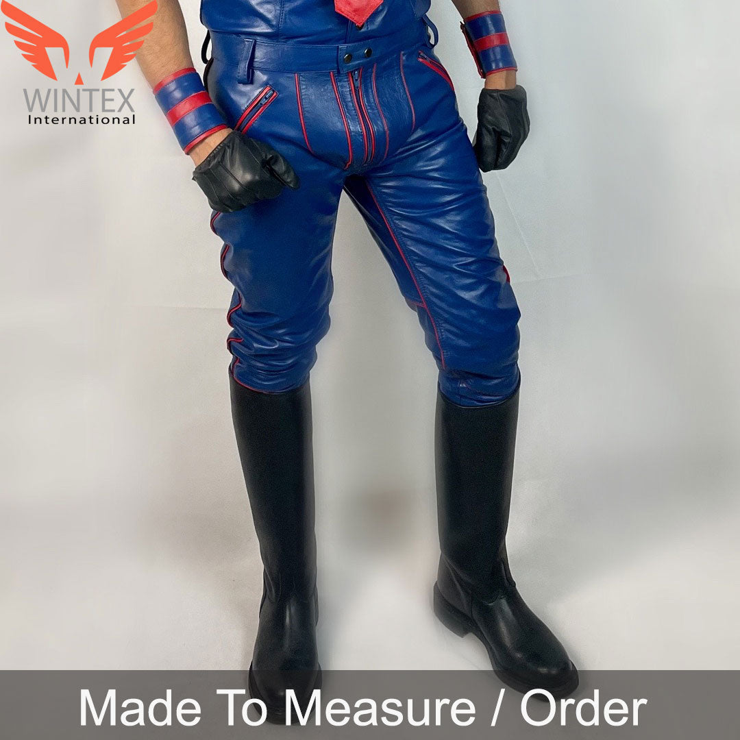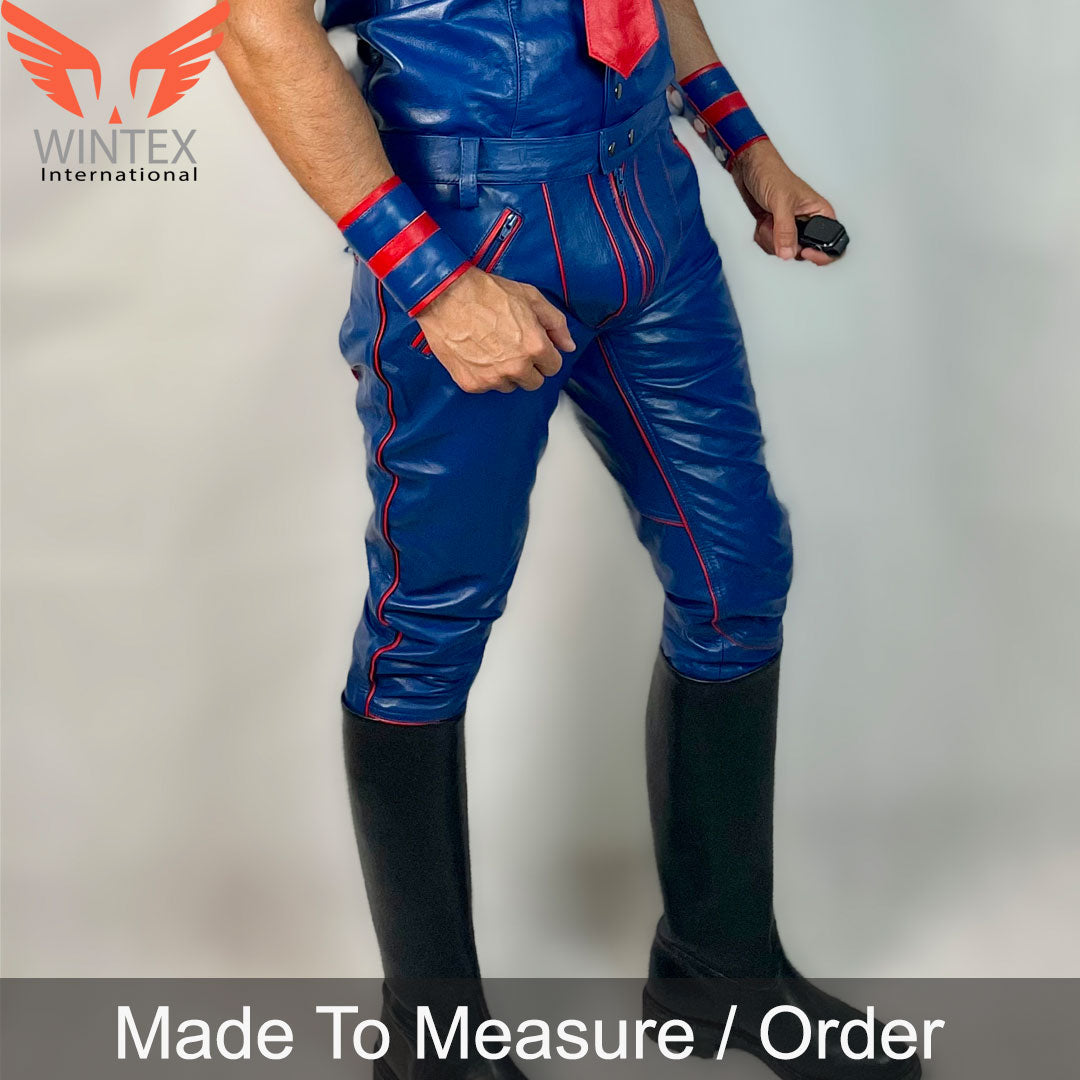 Men’s Real Leather Bikers Pants in Blue Color with Red Piping BLUF Pants