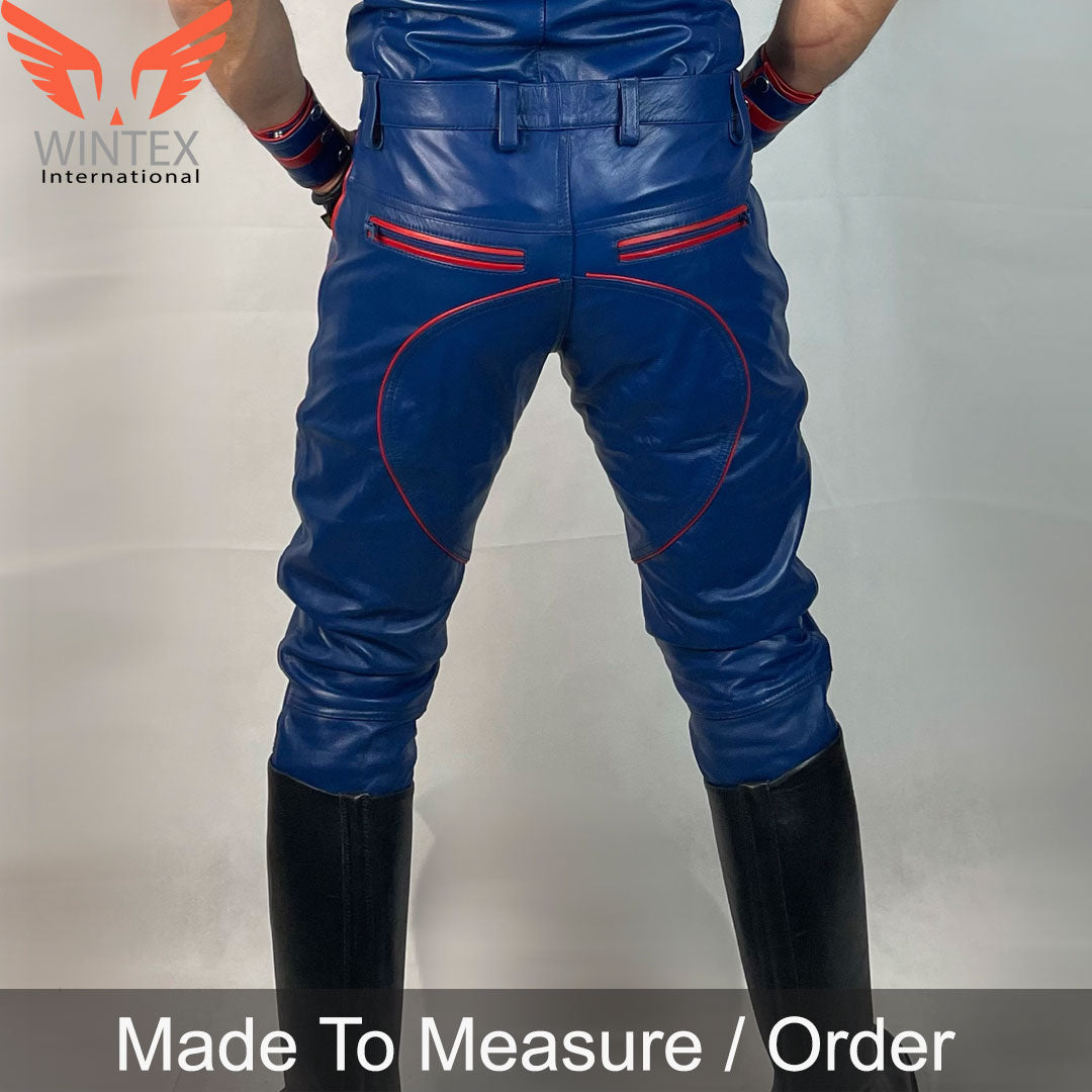 Men’s Natural Leather Bikers Pants in Blue Color with Red Piping BLUF Pants