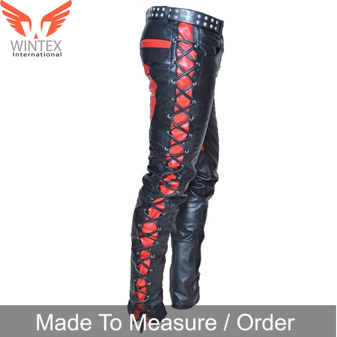Made of very fine quality COWHIDE LEATHER, Lace’s upfront and closure, Saddle Seat Style Back, Side & Front Laces Up, Leather strings for adjustment and snug-fitting, Contrast Leather Pants, Black & Red leather, Fine quality polyester lining.