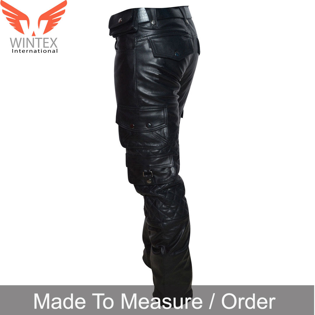 Men’s Real Leather Bikers Pants With Quilted Panels And Cargo Pockets Trousers
