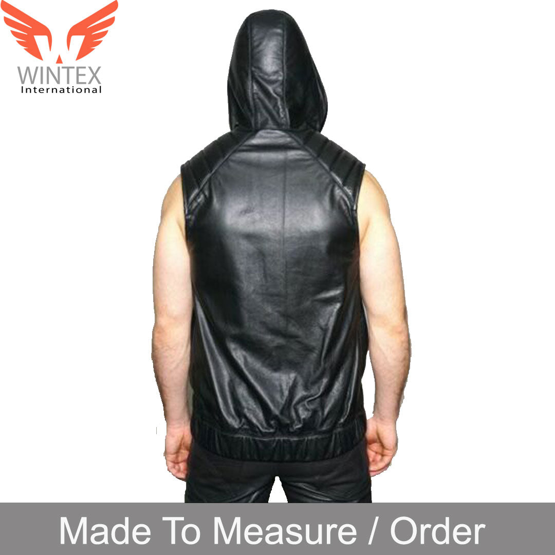 Men’s Real Leather Vest With Hood Quilted Panels Leather Sleeveless Hoodie