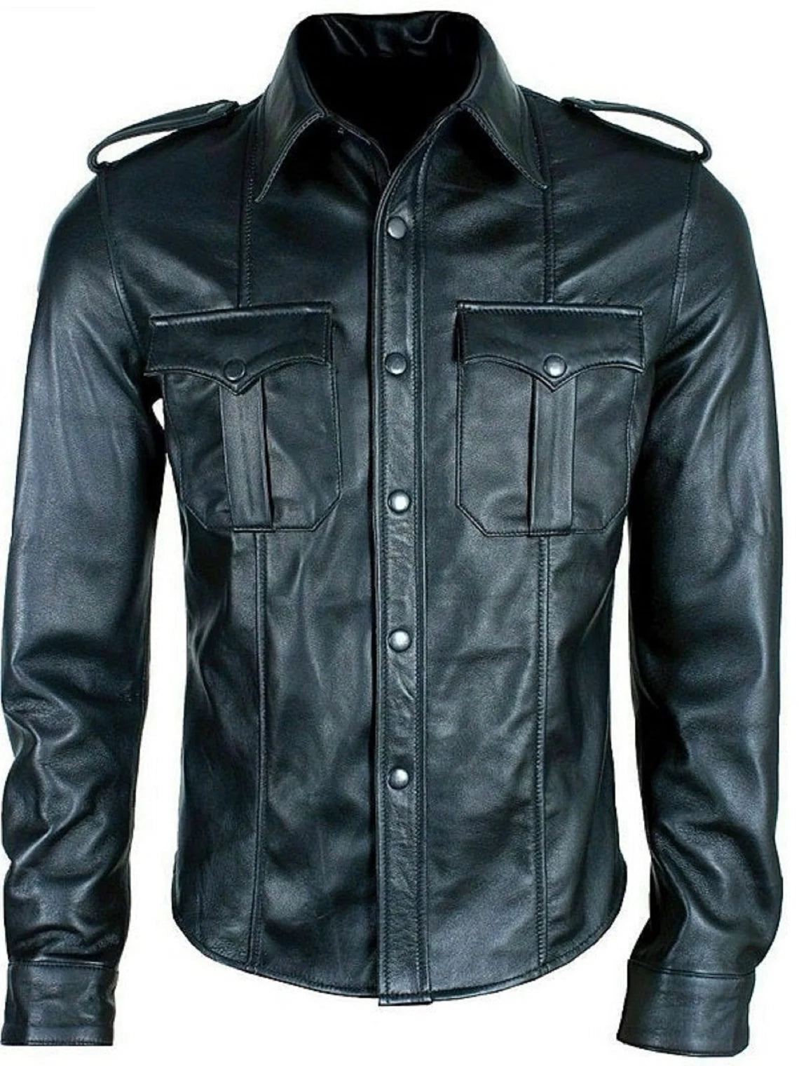 Mens Real Lamb Leather Police Style Long Sleeve Shirt
