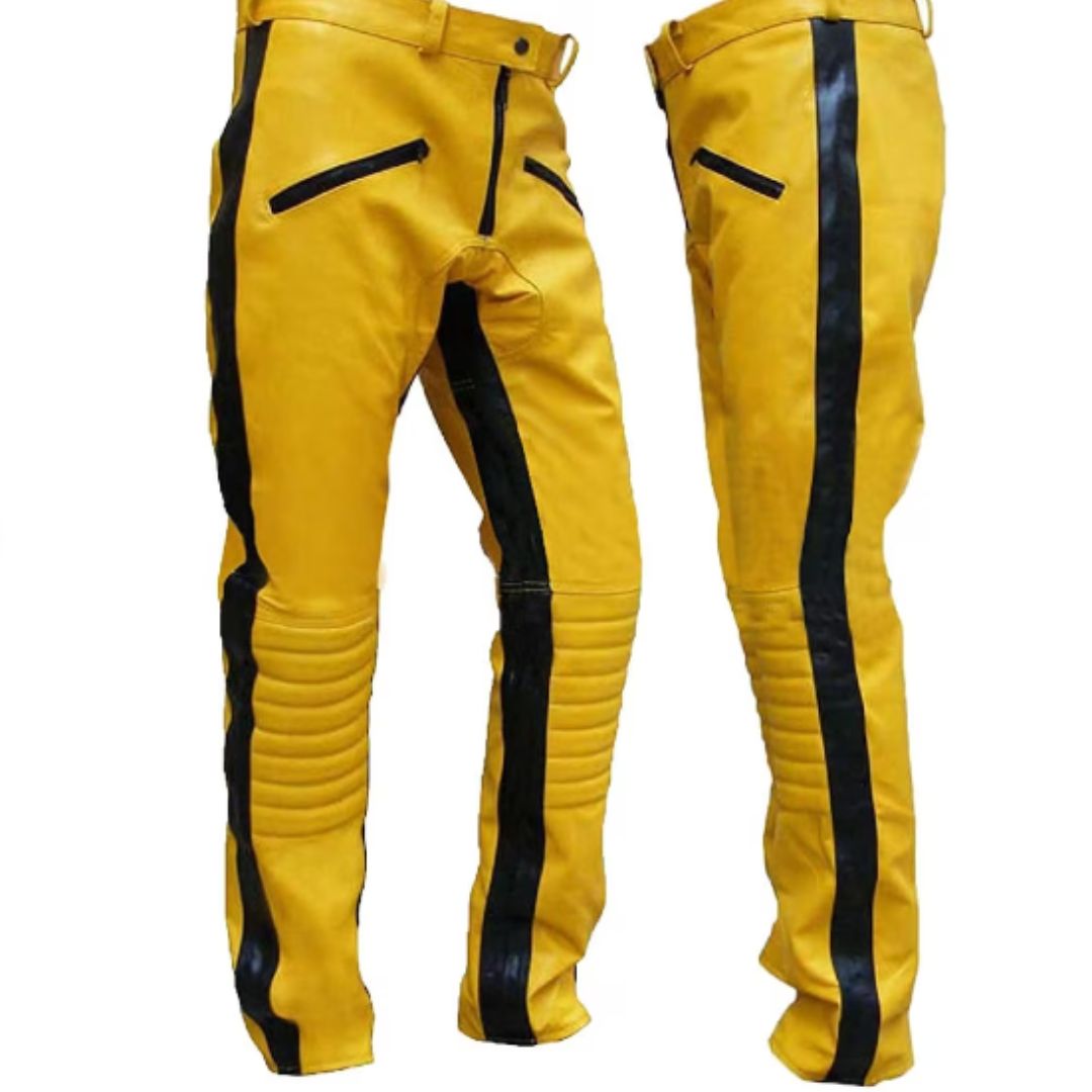 Men's Real Leather Bikers Pants Quilted Panels With Stripes & Piping