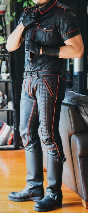 Men's Real Leather Quilted Panels Pants Contrast Thread & Police Shirt And Tie