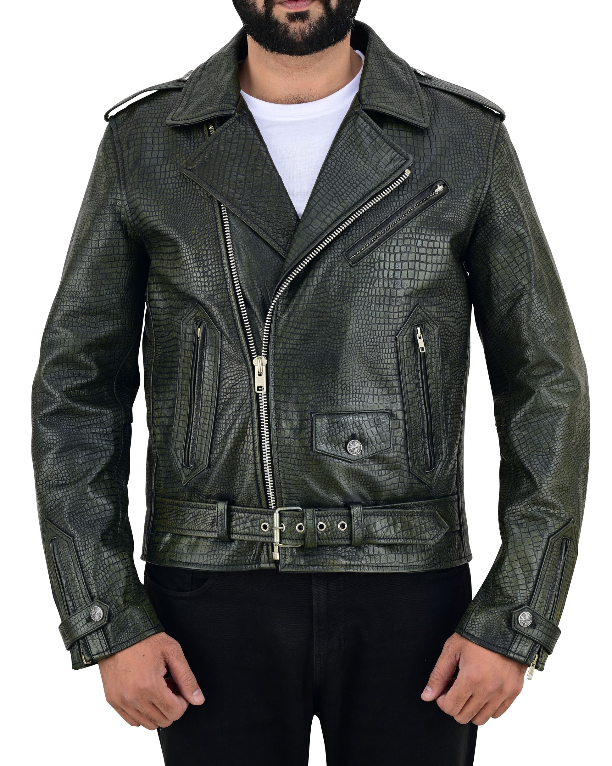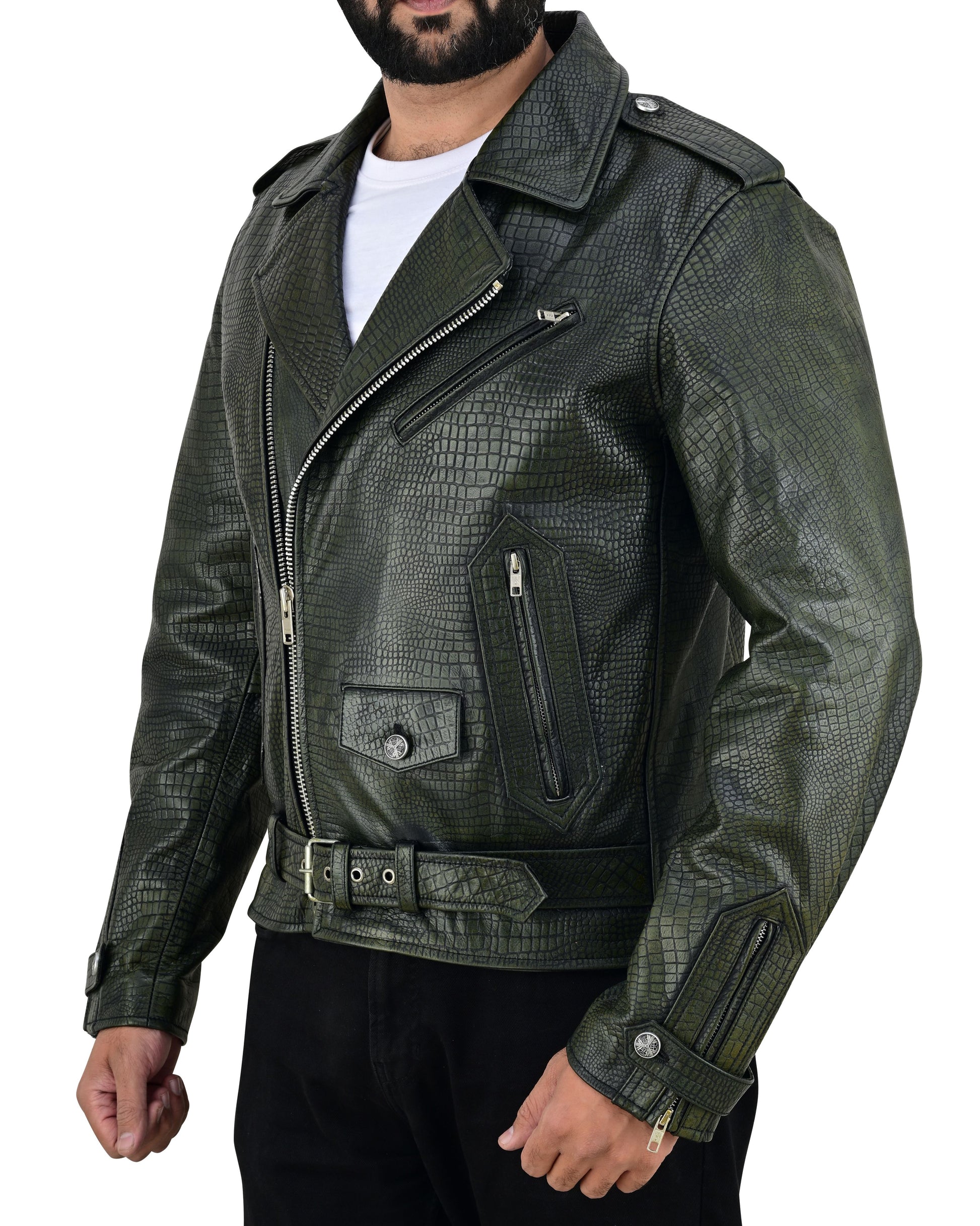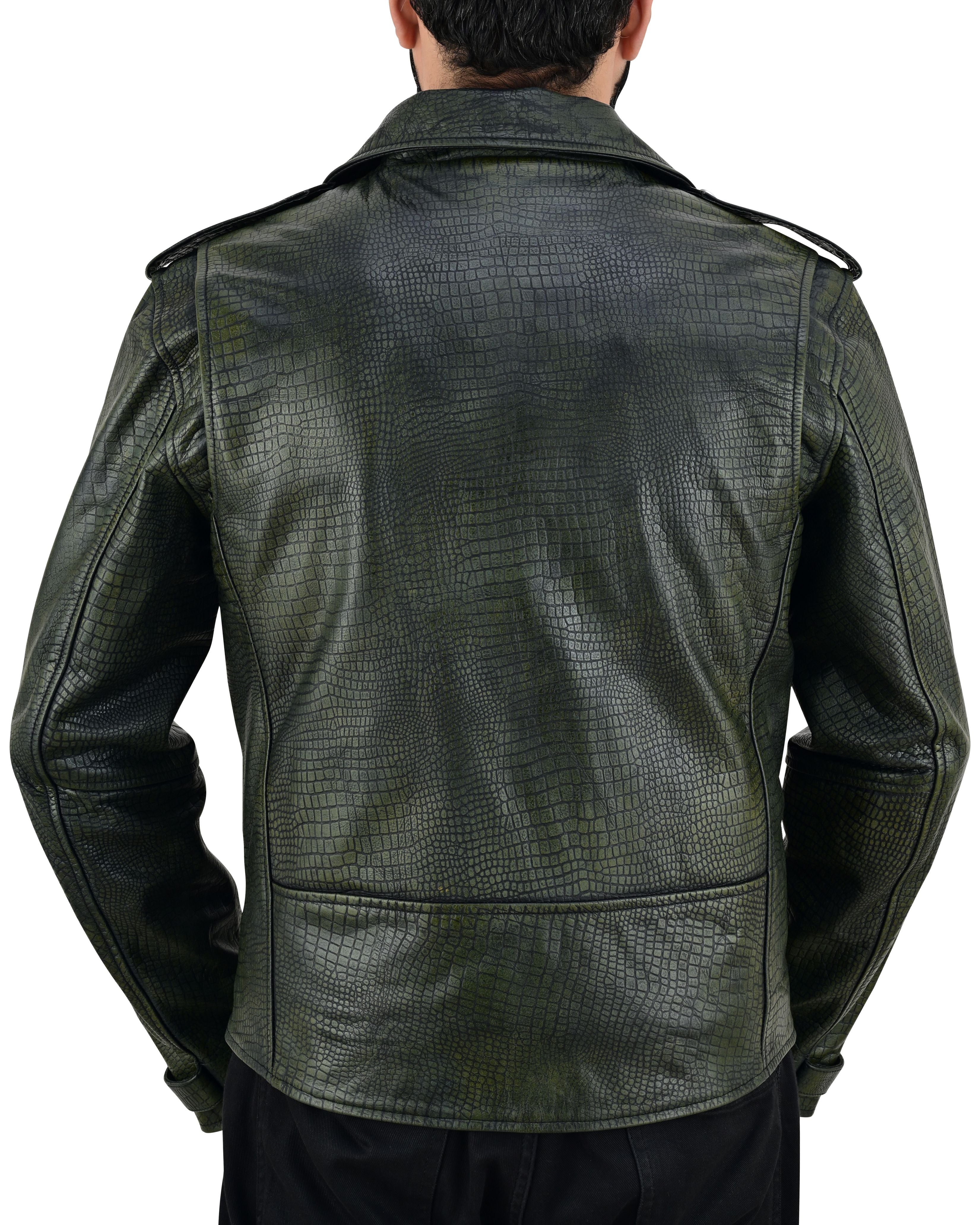 Men's Real Vintage Cowhide Crocodile Print Leather Biker Jacket