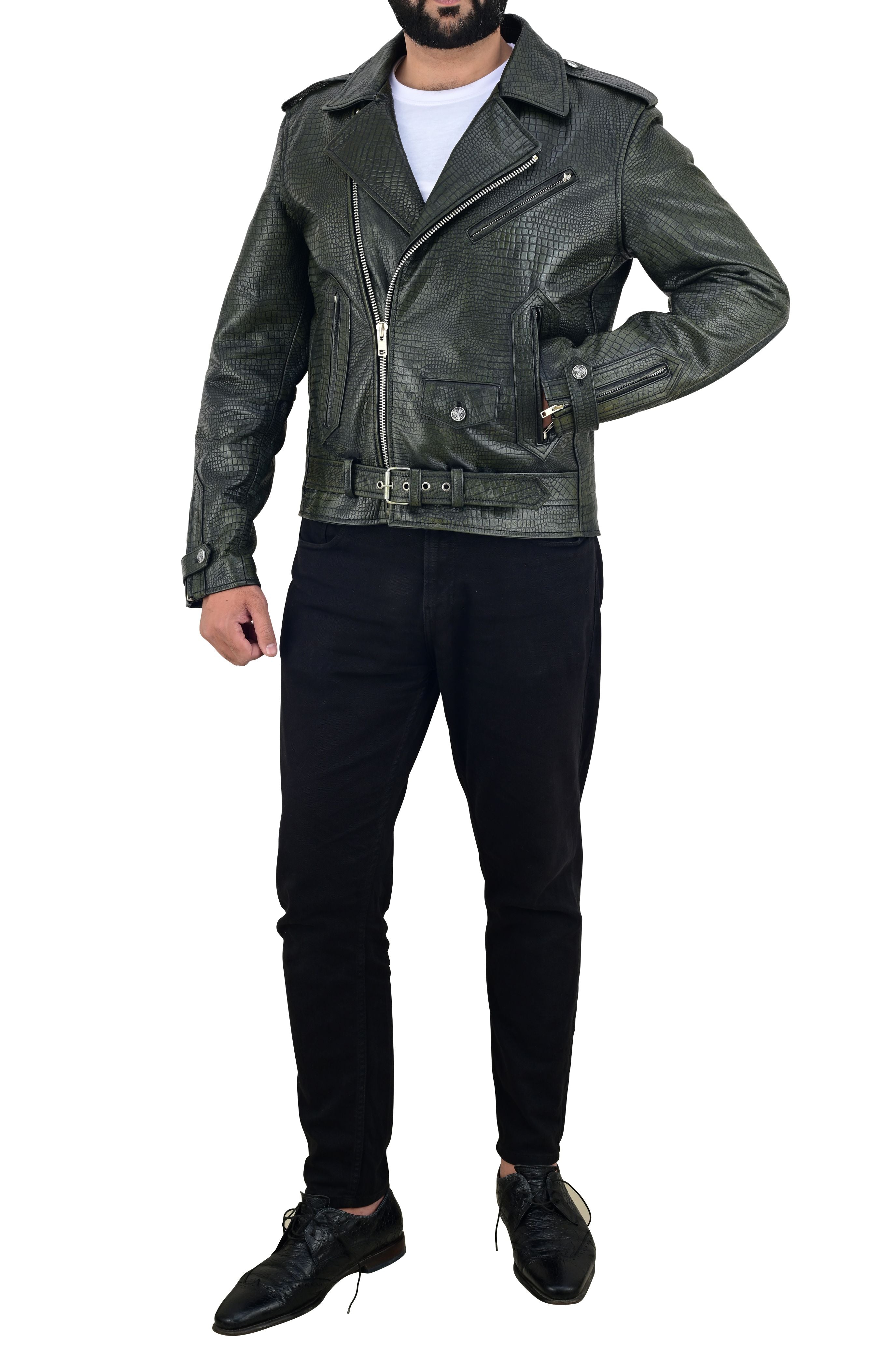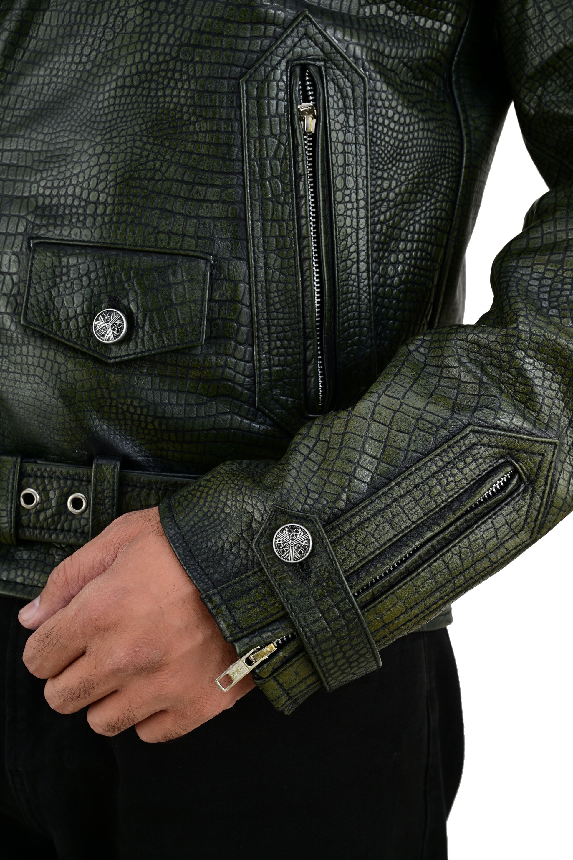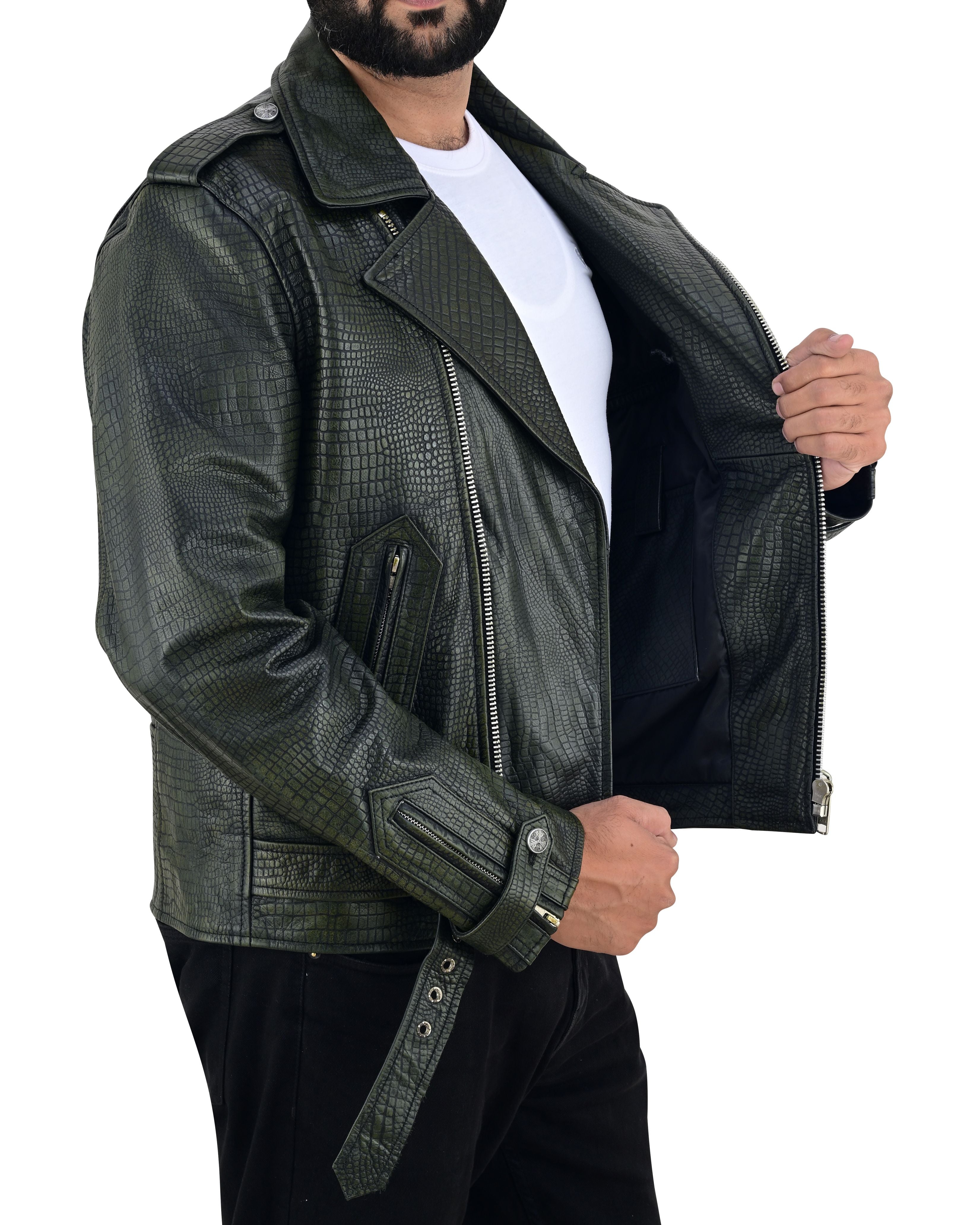 Men's Real Vintage Cowhide Crocodile Print Leather Biker Jacket