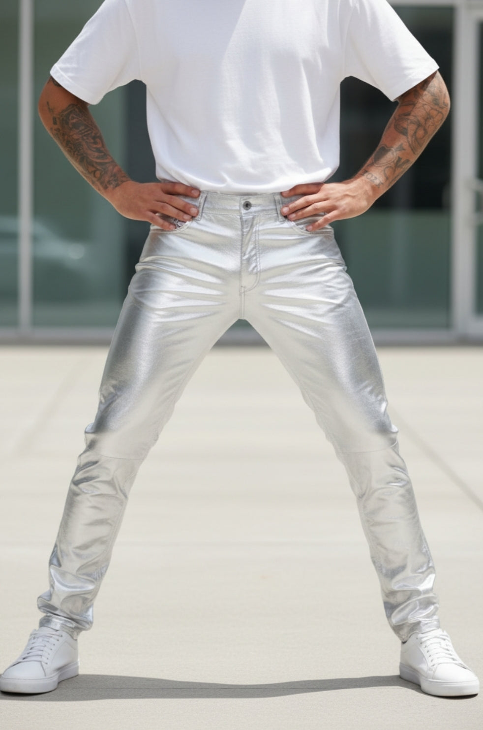 Men's Lamb Leather Silver & Gold Colors 5 Pockets Pants Lamb Leather Pants: