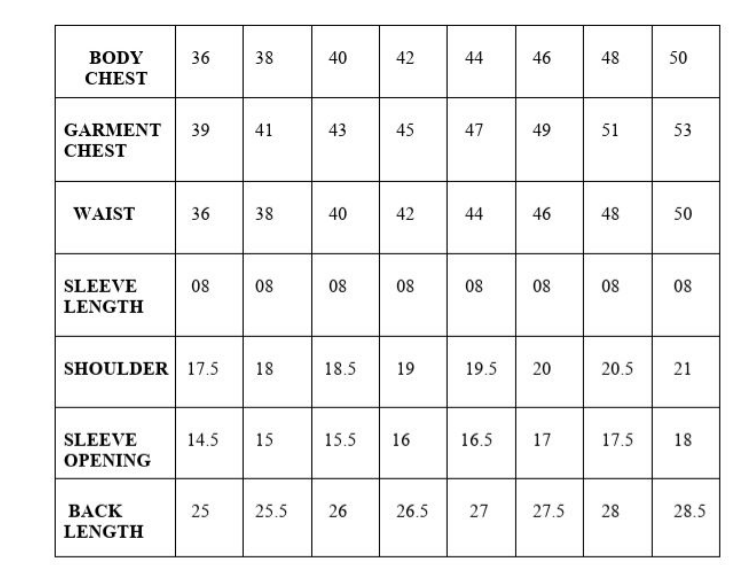 Available in a range of 34, 36, 38, 40, 42, 44, 46, 48 Inches Chest sizes. KINDLY PROVIDE US YOUR ACTUAL MEASUREMENTS OF CHEST, SHOULDER, AND WAIST WITHOUT ADDING ANY EXTRA LOSING.