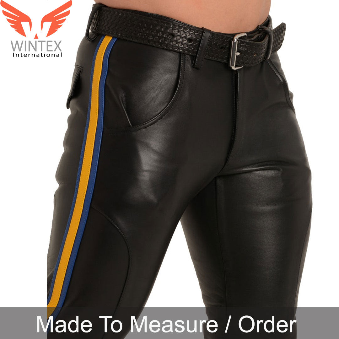 Wintex made of fine and Soft Quality Natural Grain Cowhide Geniune Leather Pants, Snap Button Closure, YKK Zips, Fly Zip, 2 Front Pockets, 2 Back Pockets, Contrast Side Stripes, Polyester Lining till Knees for extra comfort, Leather Loops, 8″ Long Side Zip at the bottom, Hemmed bottoms. Durable, Elegant, and Carefully Stitched.