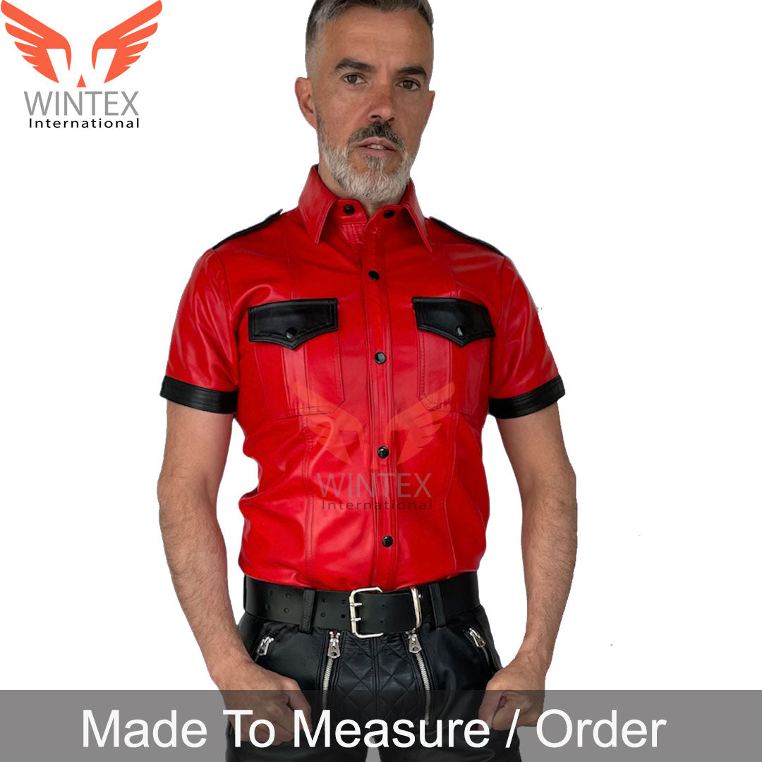 Made of fine quality Natural Grain Lamb Leather. Ideal Casual / Clubwear / Gay Outfit. Police Style chest pockets and epaulets. Chrome press stud buttons. Polyester fine lining.