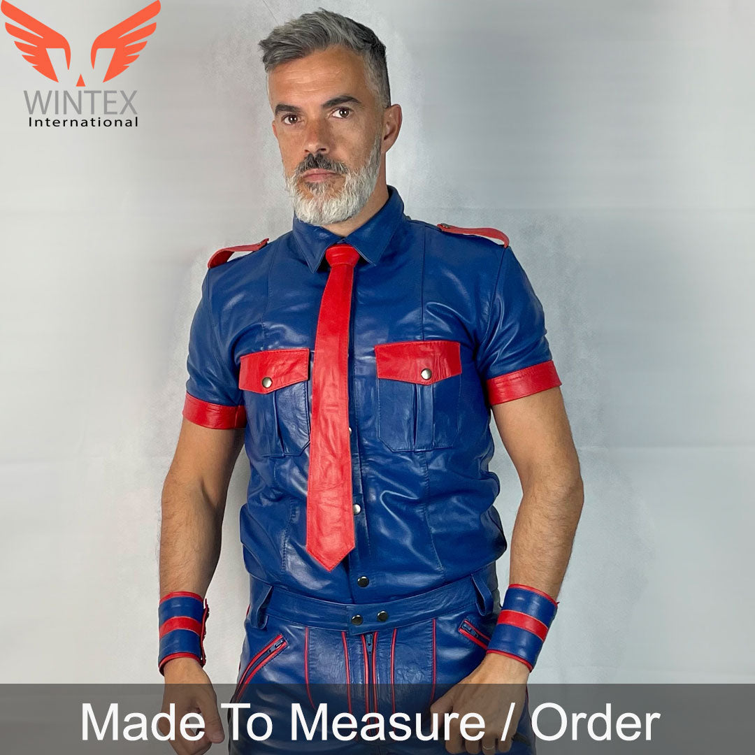Men’s Real Leather Police Bluf Shirt in Blue Color with Red Piping+ FREE WRISTBANDS
