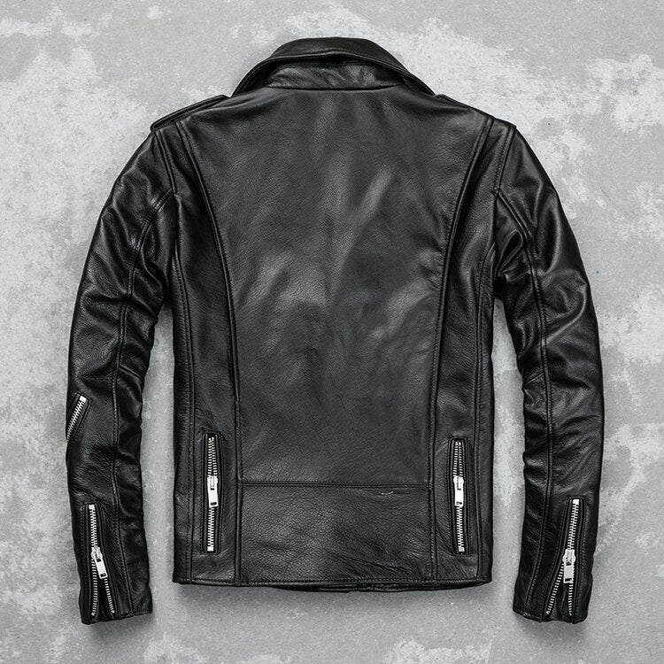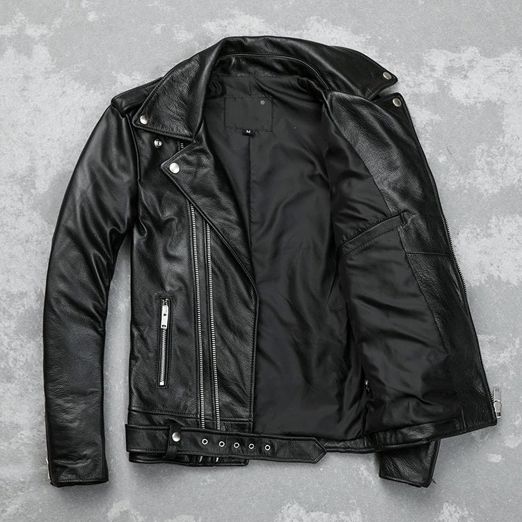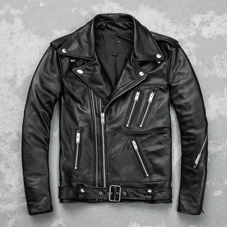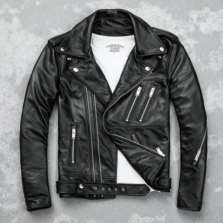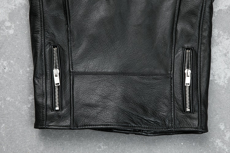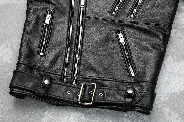 Zip Up Front ,Genuine Thick Leather. Strong & Durable.5 Zipped Pockets, Waist Belt, Zipped Cuffs, Back Zips,2 Inner Pockets .Classic Brando Style, Studded Lapels and Epaulets. Zipped Cuffs. YKK Zips Polyester Lining. Excellent Stitching and Fitting.