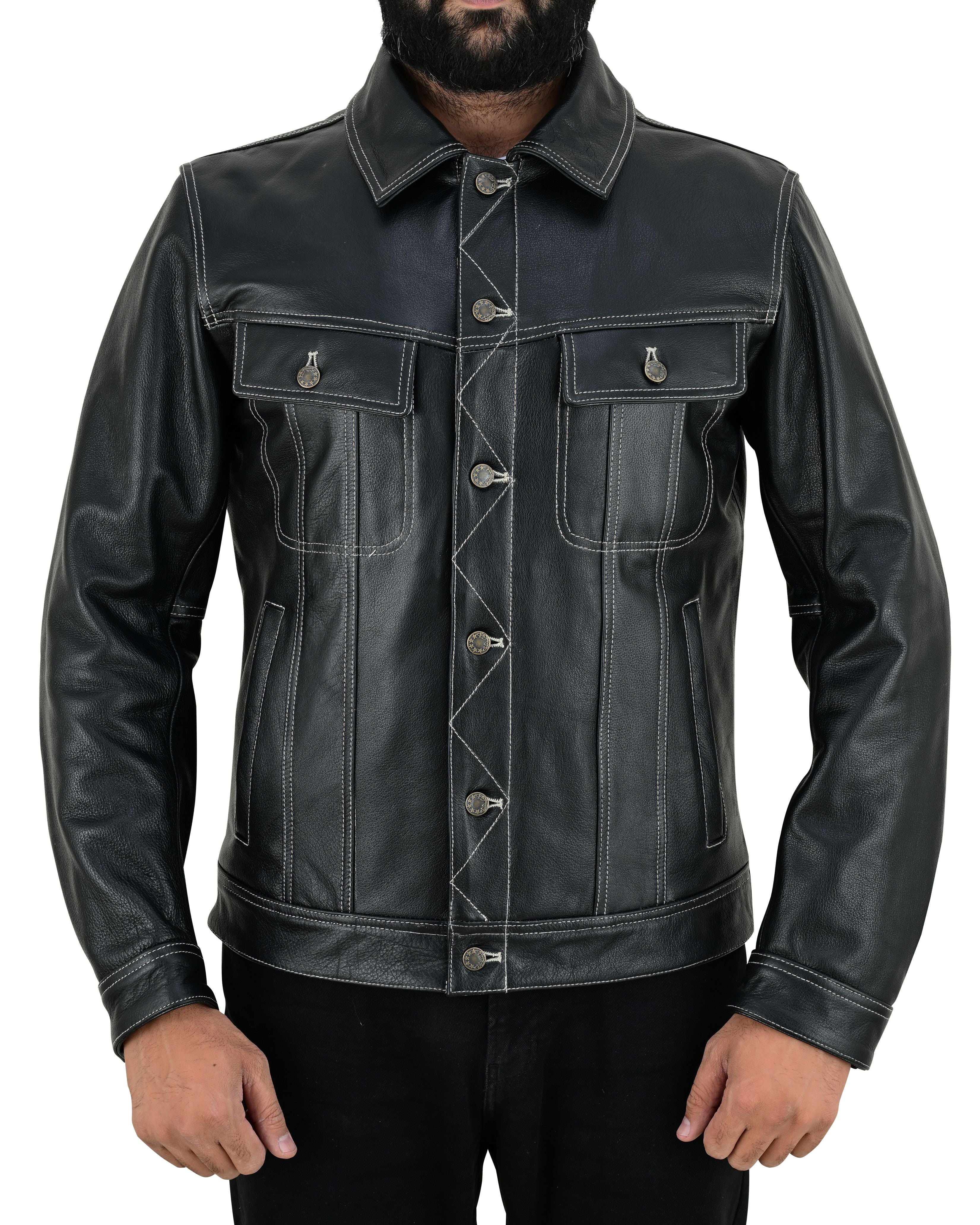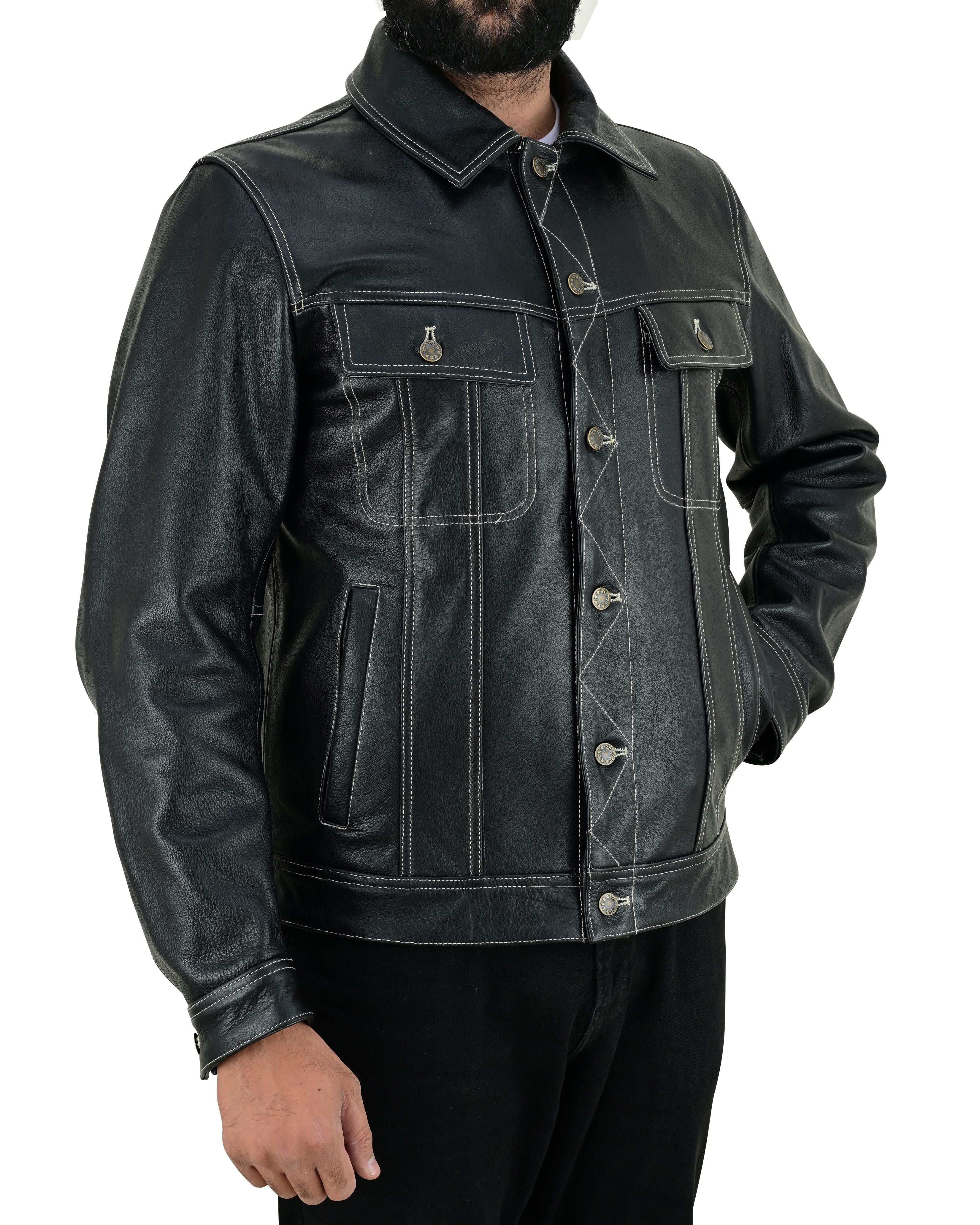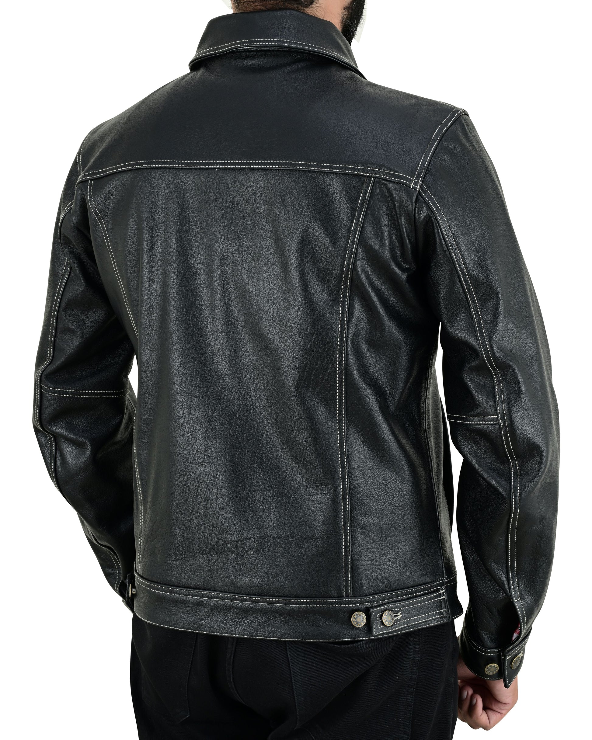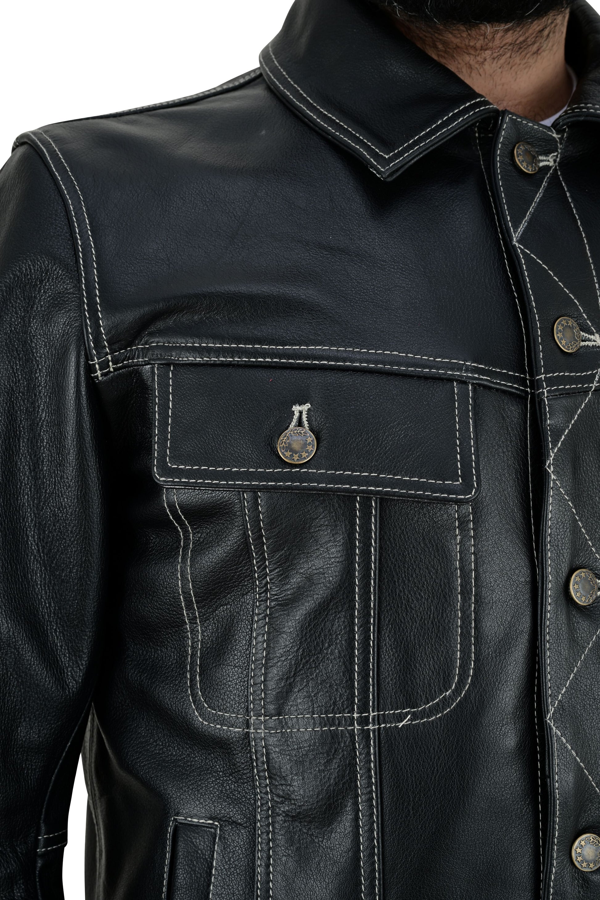 Men's Real Cow Leather Trucker Jacket Contrast White Thread Levi's Style Bikers Jacket
