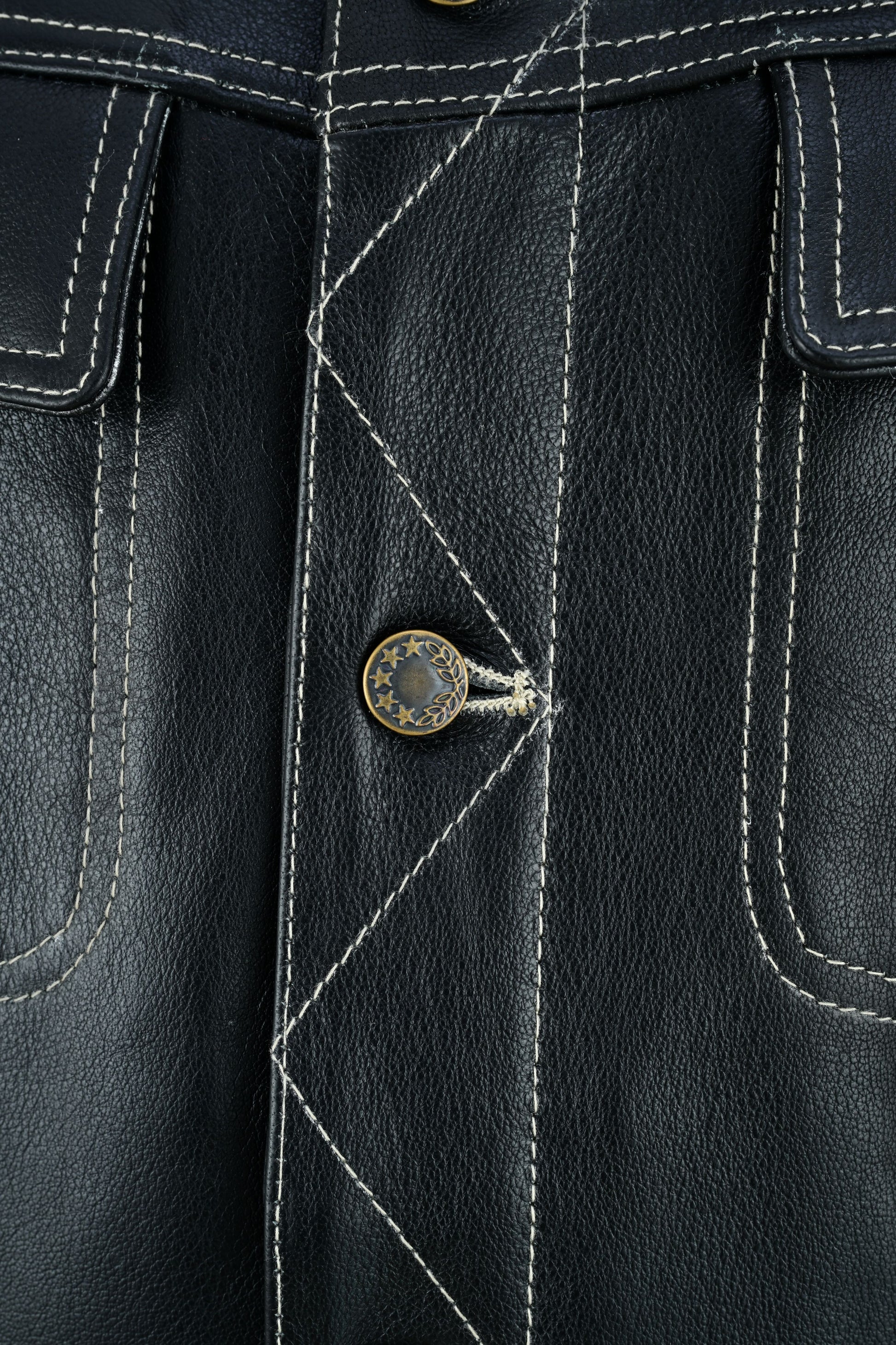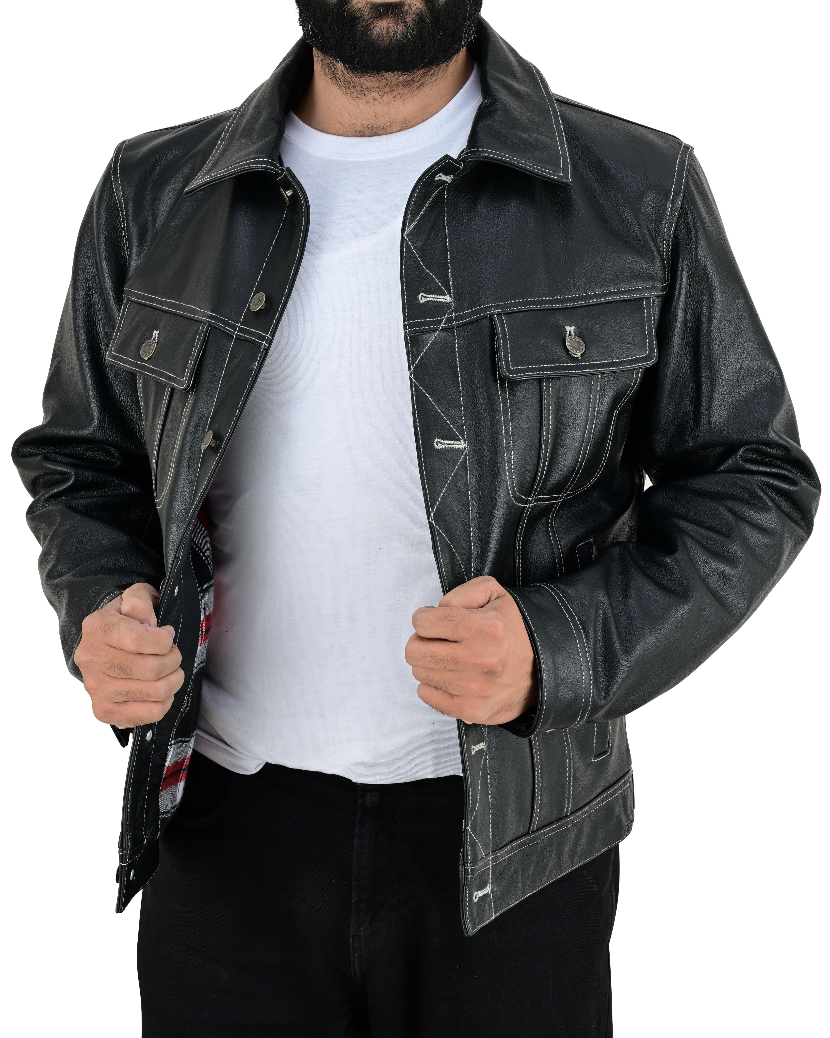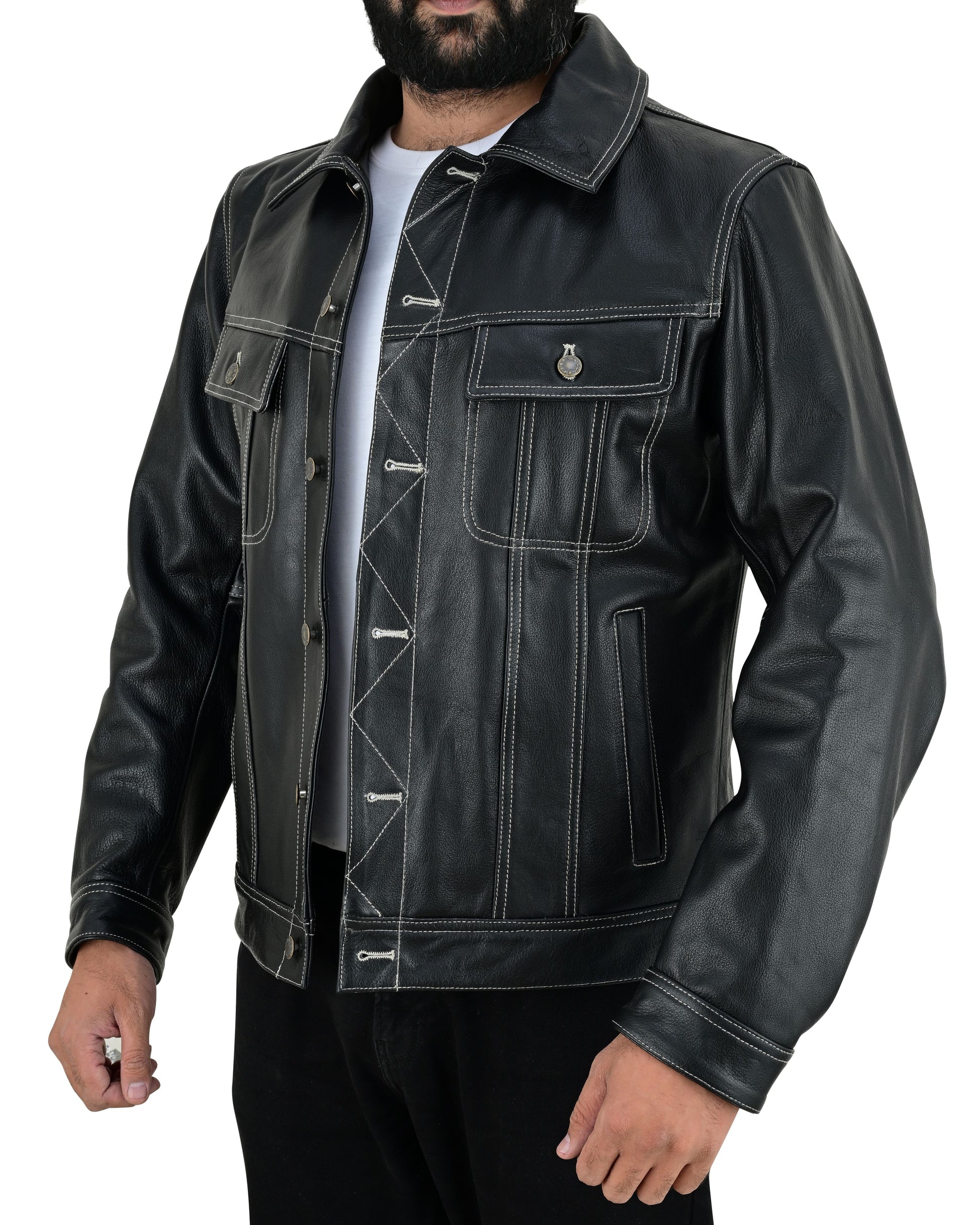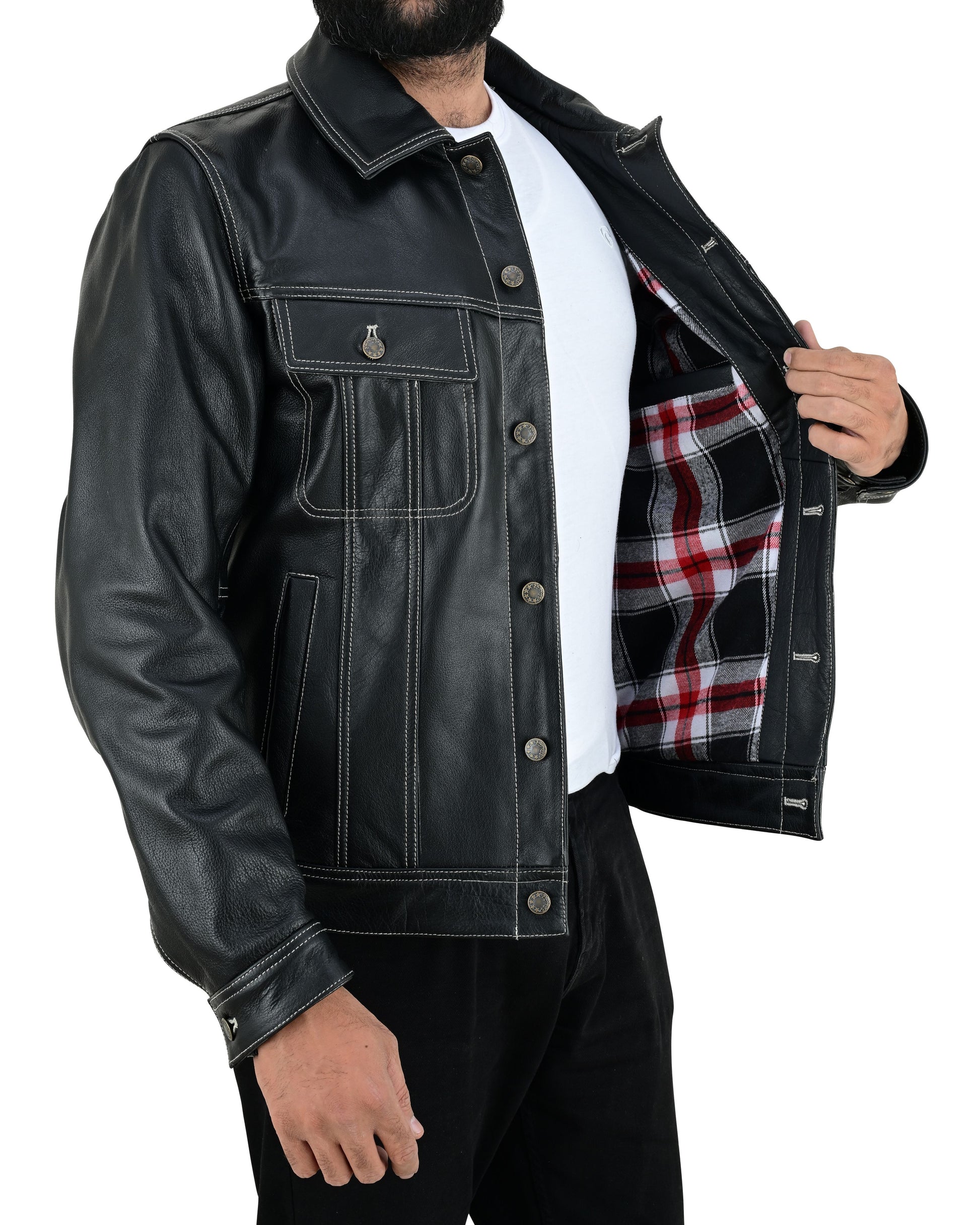 Men's Real Cow Leather Trucker Jacket Contrast White Thread Levi's Style Bikers Jacket
