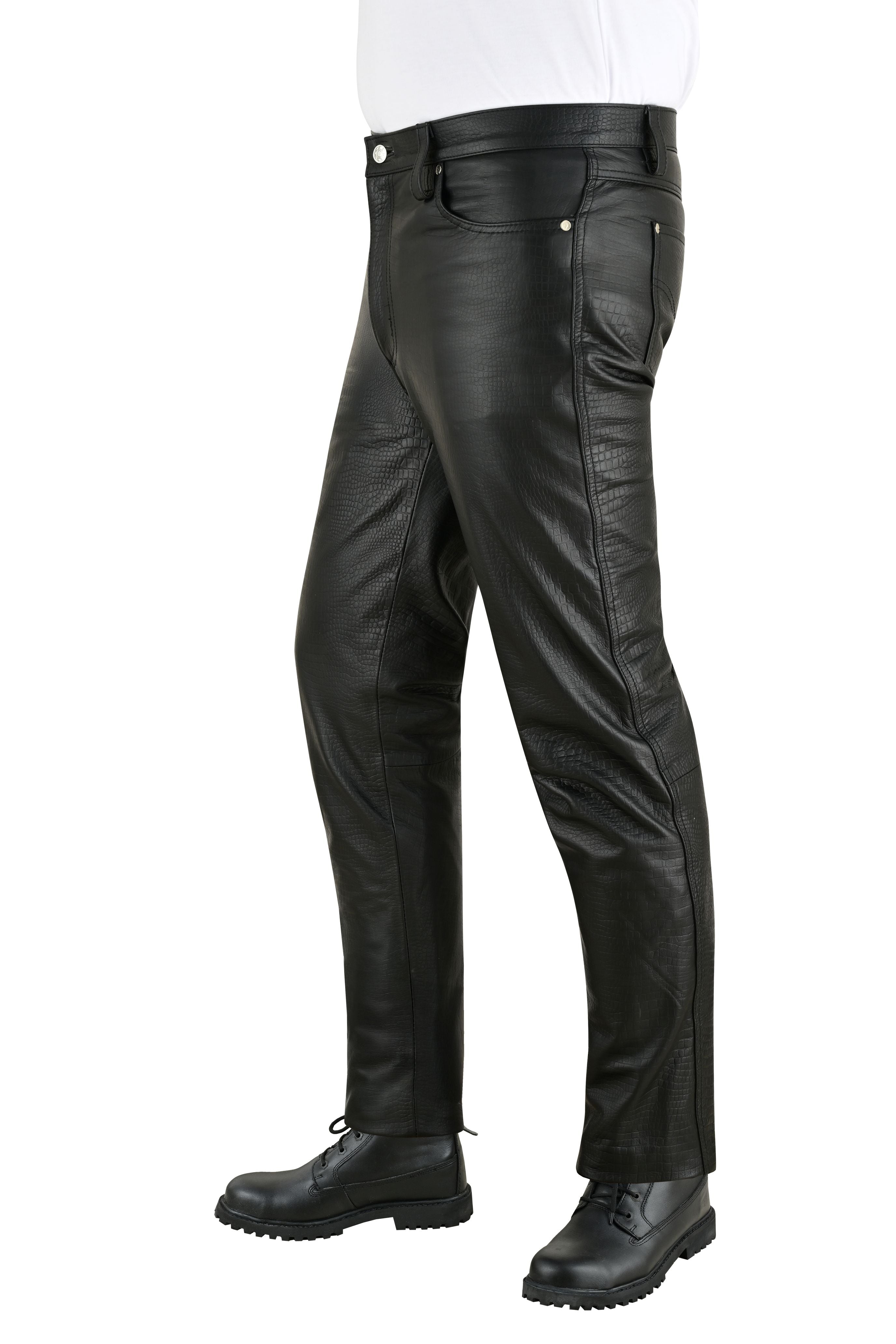 Crafted from premium cowhide leather with a distinctive crocodile print, these biker pants offer both style and durability. Featuring a 5-pocket design, snap button fastening, and zip fly, these pants are perfect for any biker or leather enthusiast looking for both comfort and a rugged look.