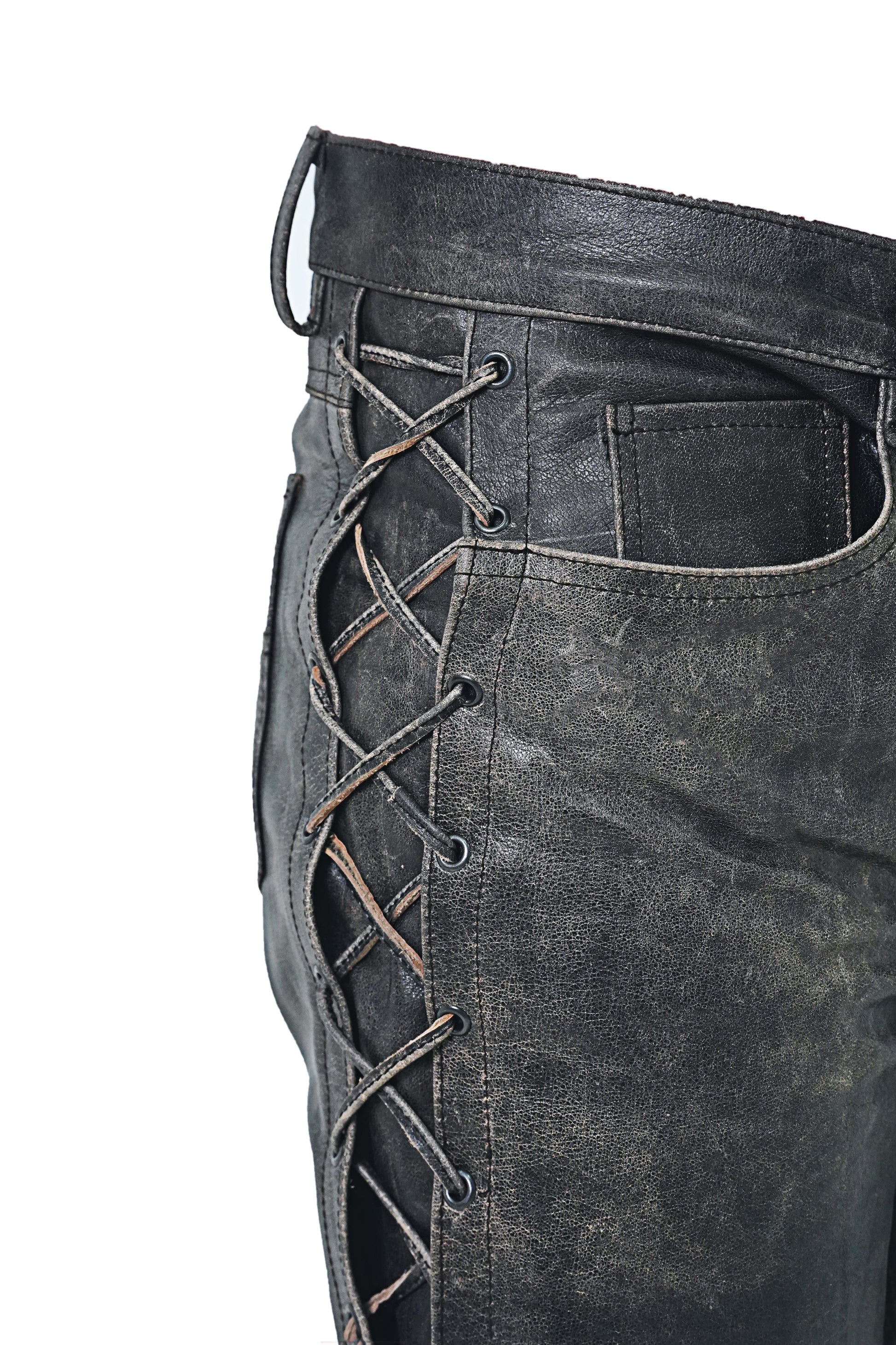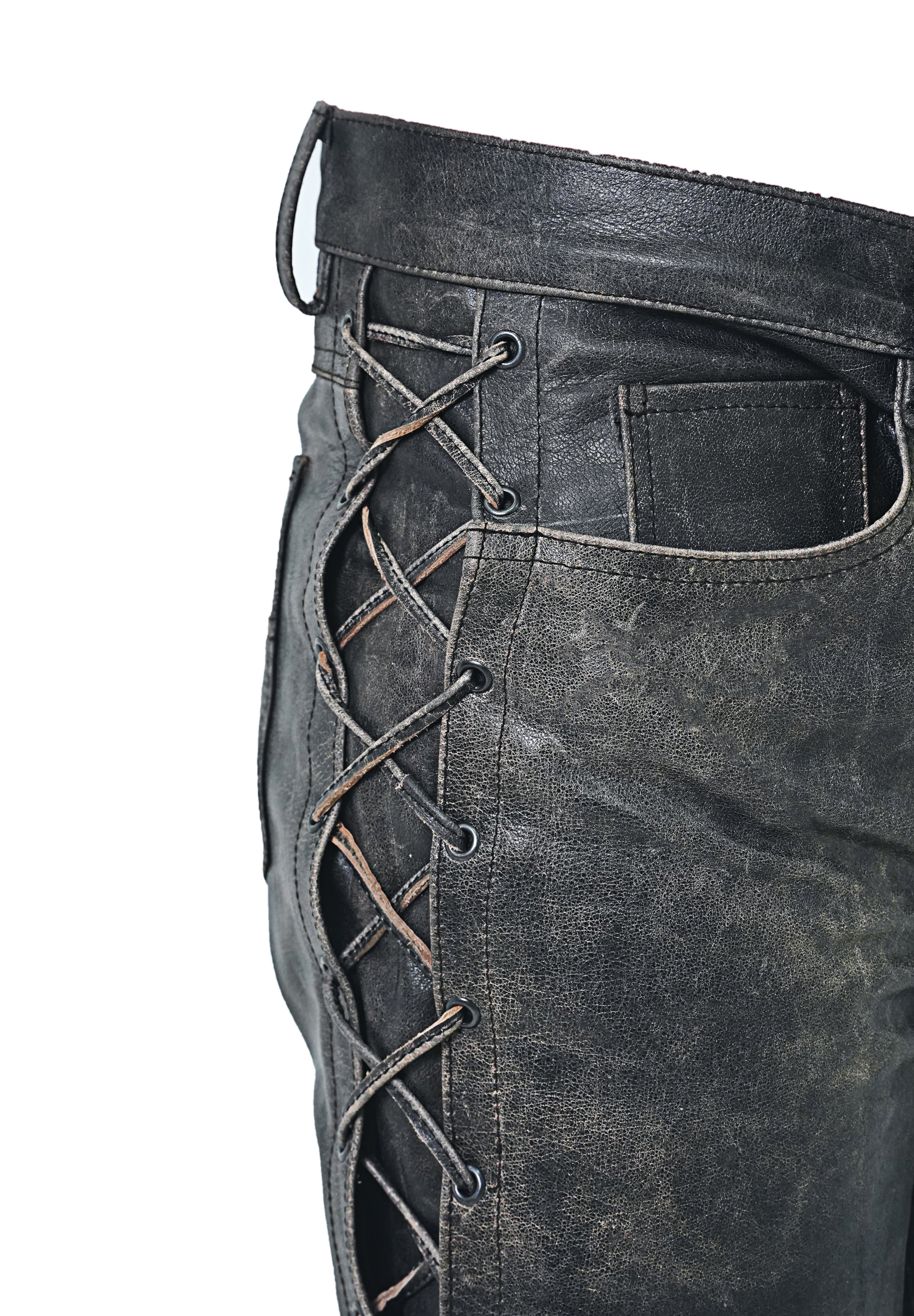 Men's Real Cowhide Distressed Leather Bikers Laces Up Pants 5 Pockets Pants
