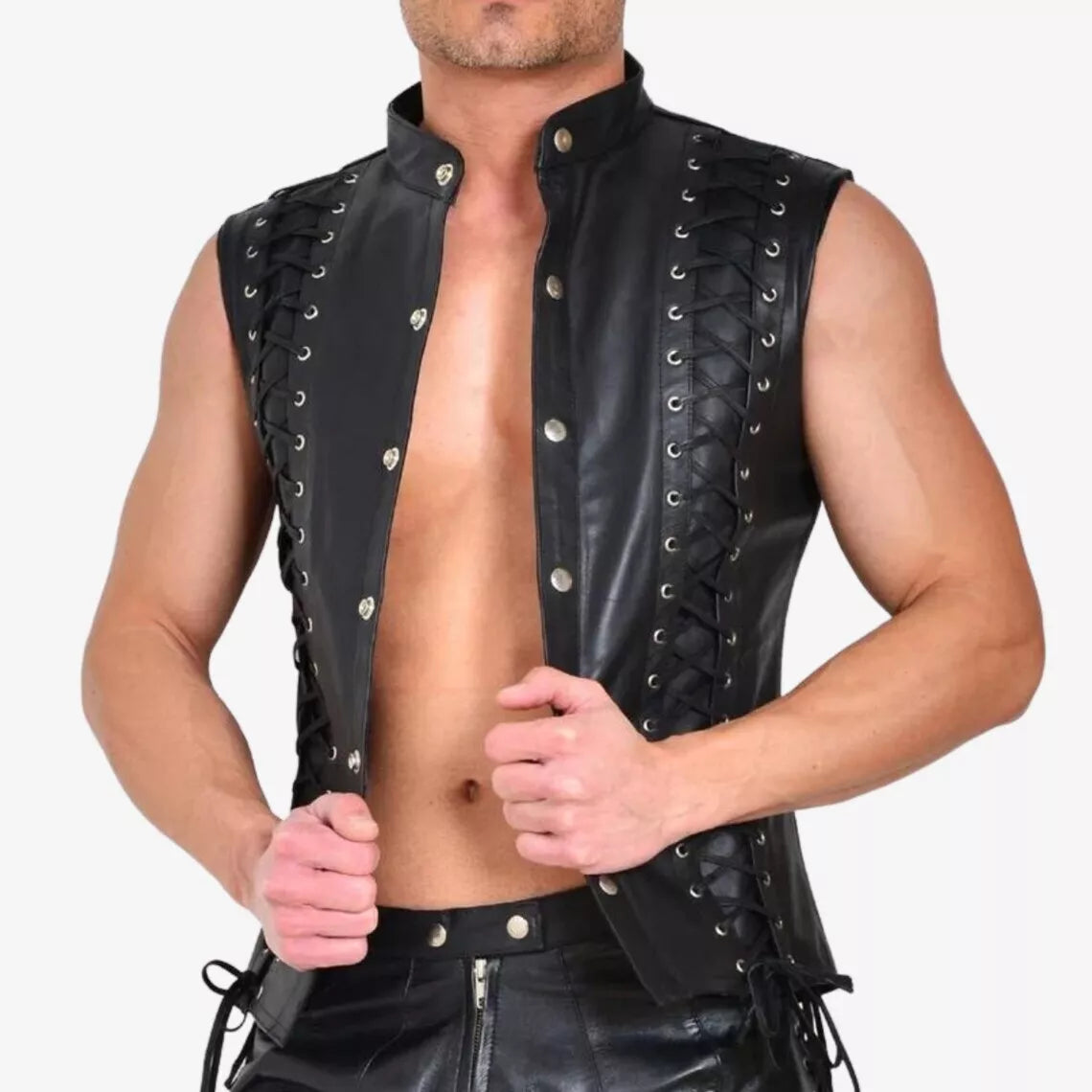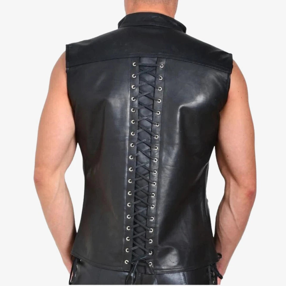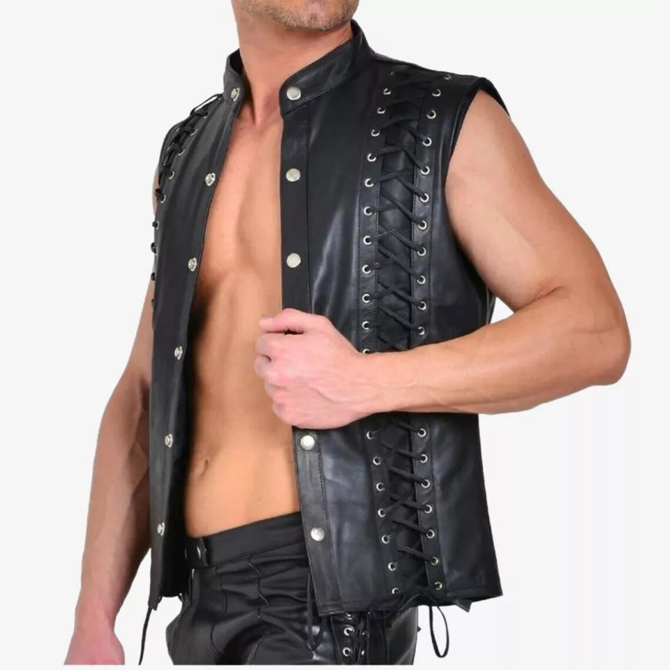 MEN'S REAL COWHIDE LEATHER BIKERS VEST FRONT & BACK LACES STYLE BIKERS VEST
