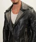 Men's Real Cowhide Leather Sliver Studded Bikers Jacket Brando Bikers Jacket