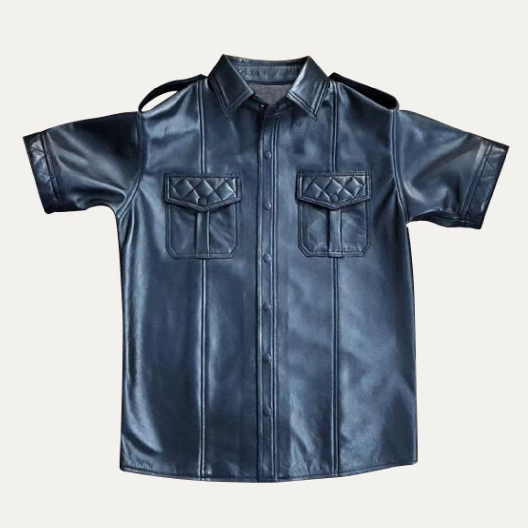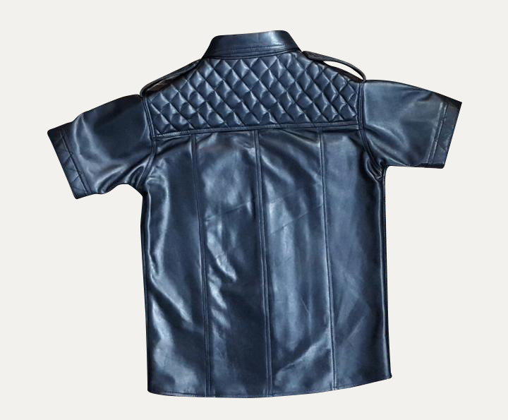 Men's Real Lamb Leather Police Shirt Quilted Panels Gay Leather Shirt