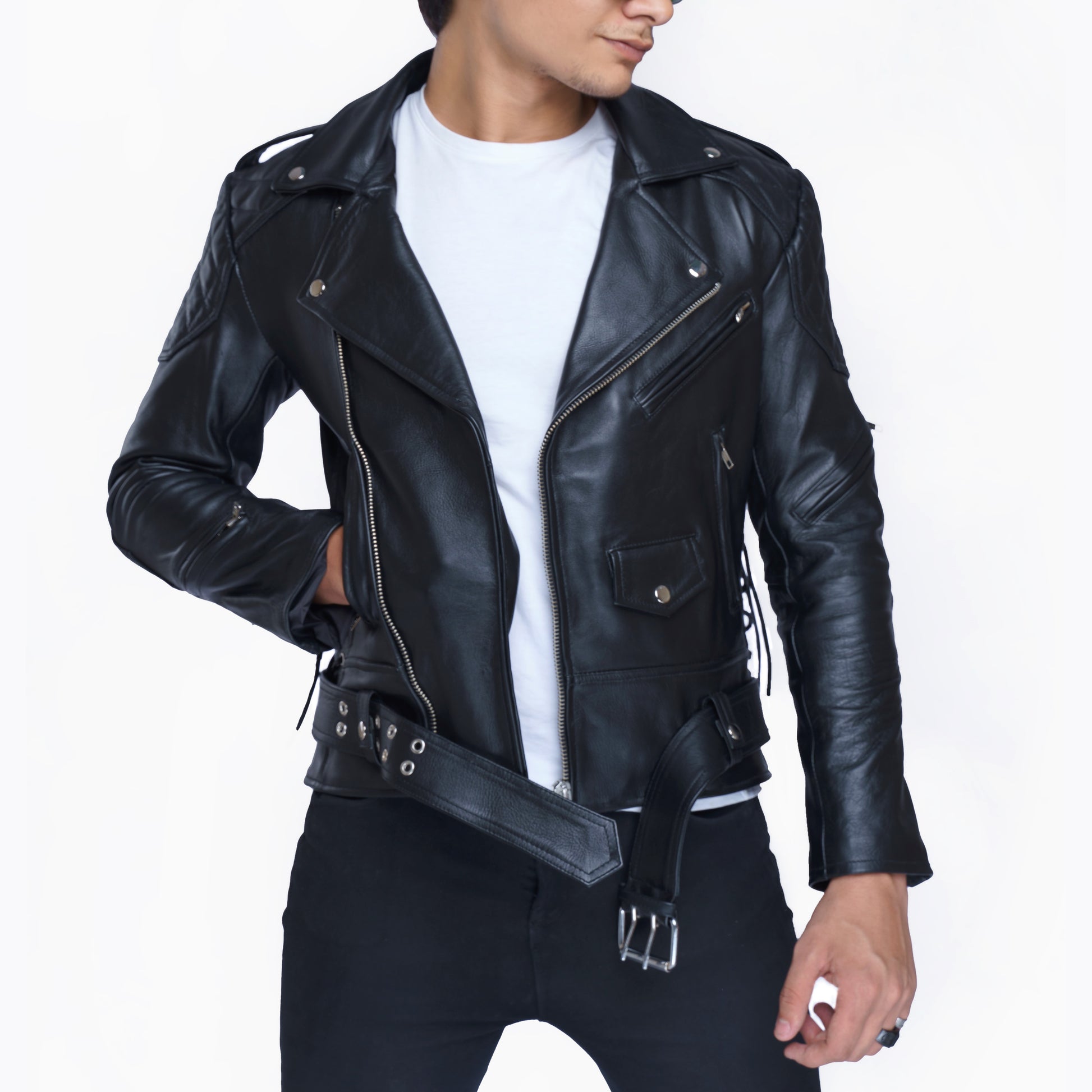 Zip Up Front, Genuine Full Grain Leather. 3 Front Zipped Pockets, 1 Coin Pocket, Button Lapels, 2 Inner Pockets. Classic Brando Style With Quilted Panels, Zipped Cuffs, 1 Zip At Sleeve , YKK Heavy Zips, Waist Belt, Polyester Lining. Strong & Durable Excellent Stitching and Fitting.
