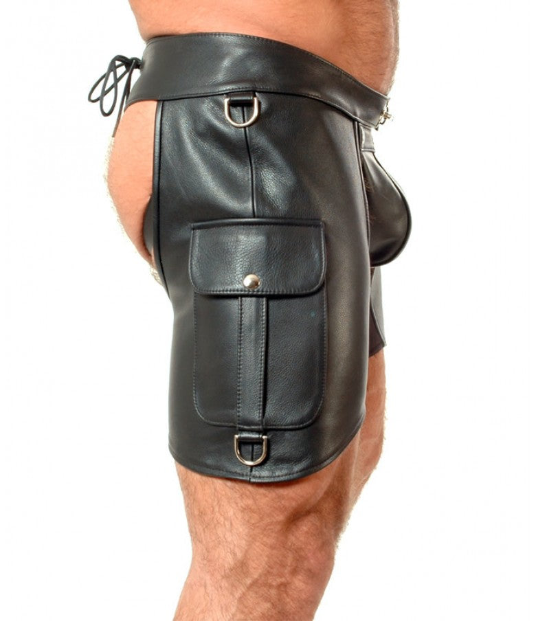 Men’s Cowhide Leather Cargo Pockets Chaps Shorts With Detachable Jockstrap