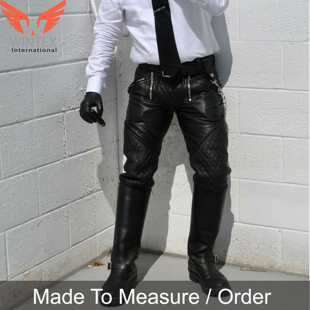 Real Cowhide Leather Qualited Panels Carpenter Pants, Snap Button Closure, Front Carpenter Style, YKK Zips, 2 Front & 2 Back Zipped Pockets, Zip At Back, Black Leather Quilted Panels, Black Double Stripes, Polyester Lining till Knees for extra comfort, Leather Loops, 8″ Zip At Bottom, Hemmed bottoms. Durable, Elegant, and Carefully Stitched. ALSO AVAILABLE WITH BACK ZIP, PLEASE MESSAGE US YOU WANT BACK ZIP.