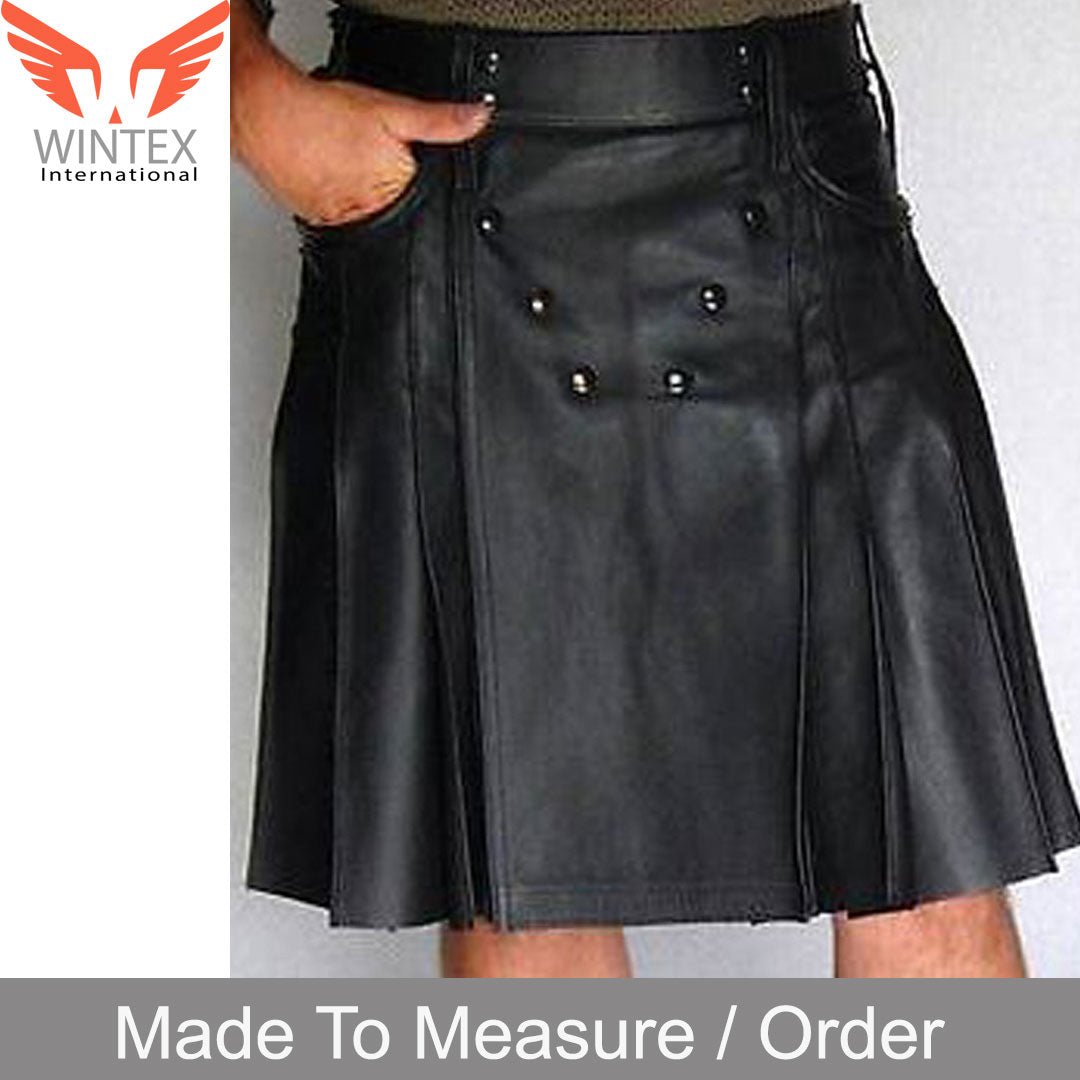 Wintex made of high-grade natural grain cow black leather kilt. Front button closure, 2 front and 2 back pockets, side waist laces for fitting, belt loops, fully lined.