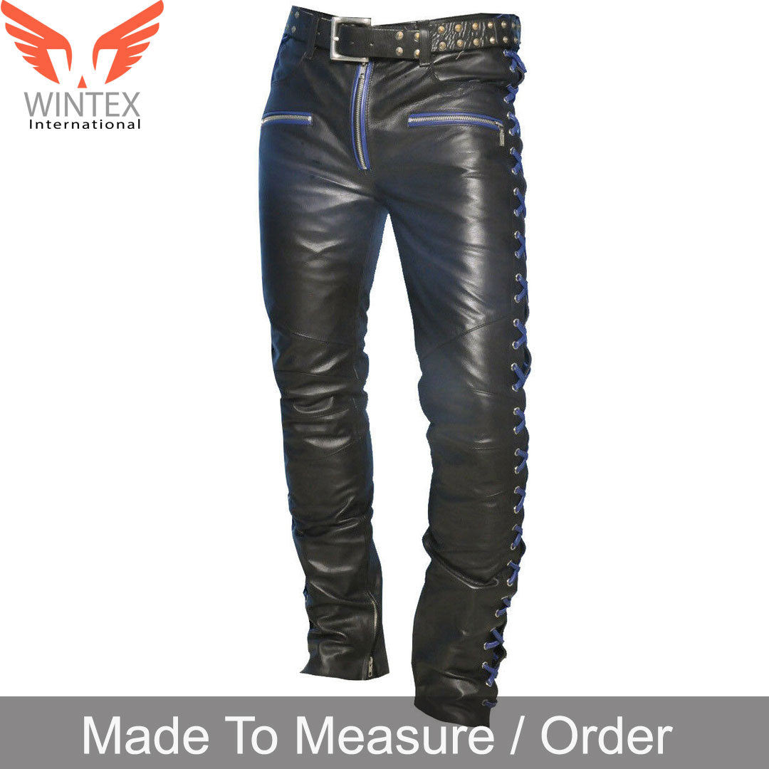 Men’s Real Cowhide Leather Laces Up Pants Bikers Contrast Laces Up Pants