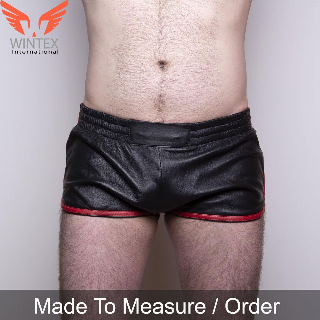 Men’s Real Lamb Leather Gym Shorts Club Shorts In Black Color With Red Stripes