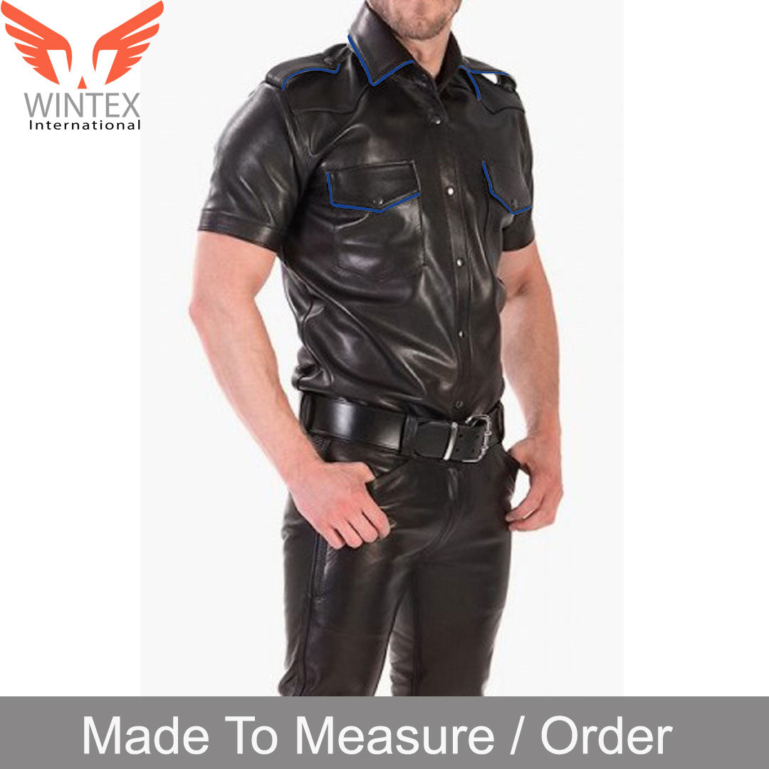 Made of fine quality Lamb Leather Shirts. Ideal Casual / Clubwear / Gay Outfit. Police Style chest pockets and epaulets. Chrome press stud buttons. Polyester fine lining.