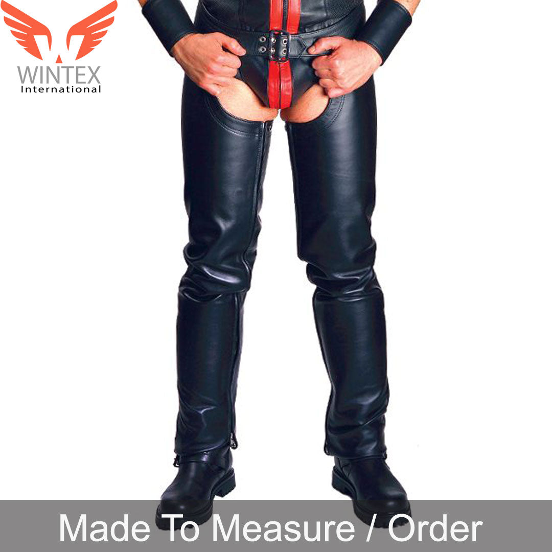 Wintex offer very smooth, soft high-quality Cow Skin Leather Men's Motorcyle Leather Chaps Codpiece is with 2 red Side stripes, These Chaps are made of one piece of soft black cowhide leather, there is no patchwork OR knee Joint at front, inside Leg are heavy duty YKK Zipper. Belt at the waistband, adjustable lace back.