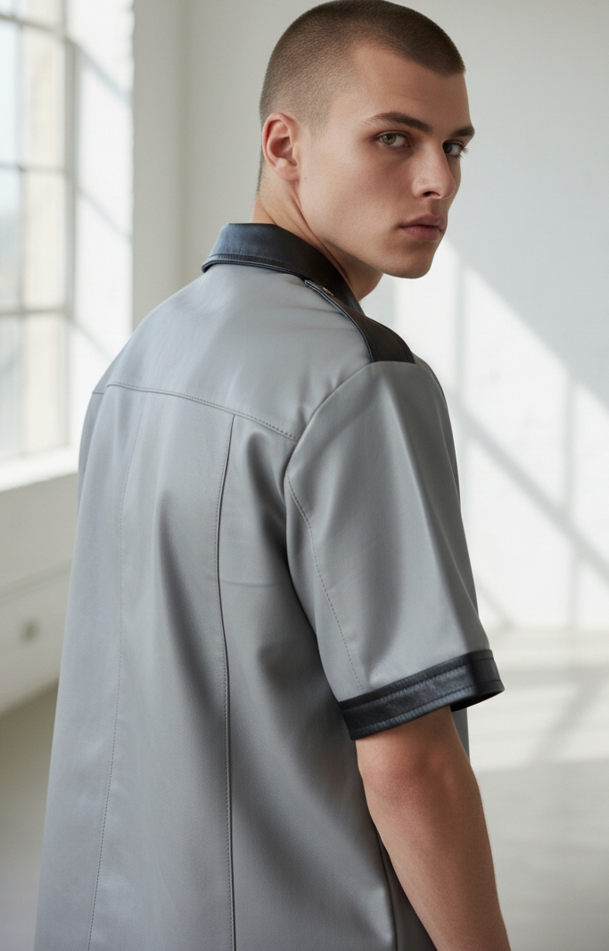 Men’s Real Leather Short Sleeves Police Uniform Shirt BLUF Shirt Contrast Trims