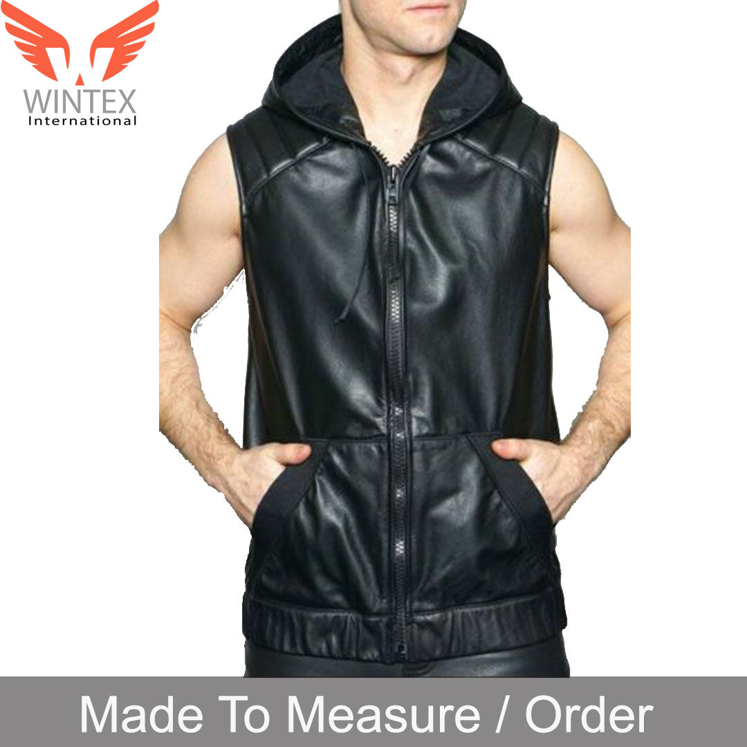 Men’s Real Leather Vest With Hood Quilted Panels Leather Sleeveless Hoodie
