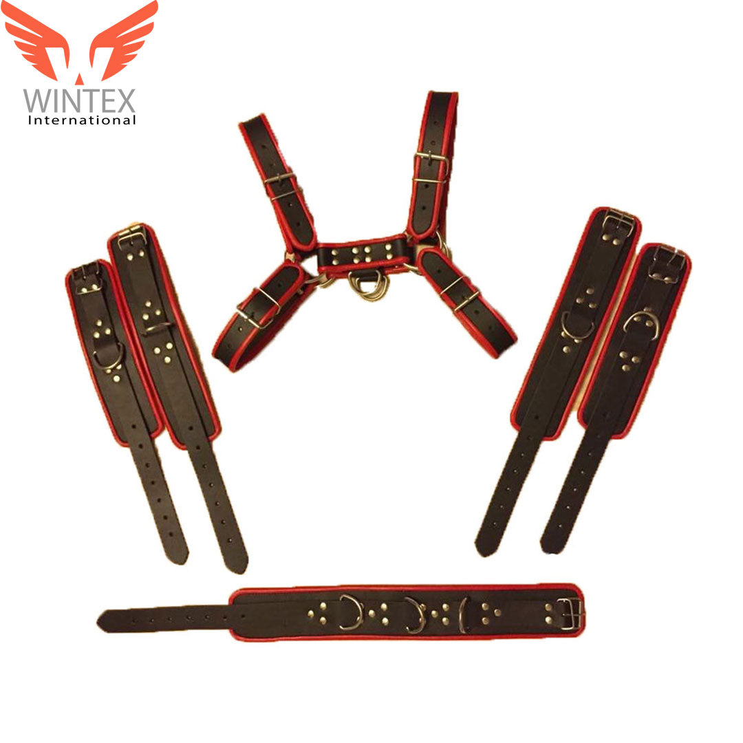 Men’s Real Nappa Leather Body Harness/ Mens Chest Harness With Red Piping + Restraints Set