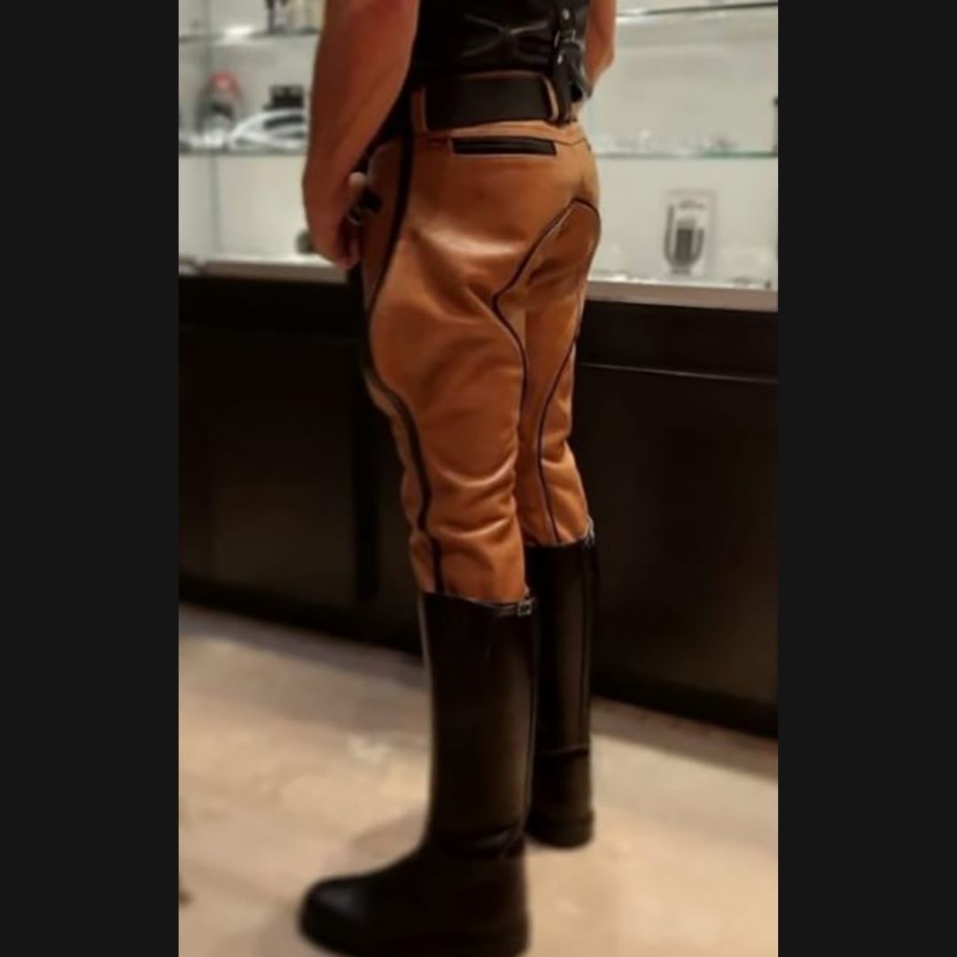 These breeches are made of fine quality cowhide leather. Zip fly, snap button closure, On the calves they have small zips for a snug tight fit when wearing it with high leather boots. The legs are not as long as normal trousers but this is better for wearing it in boots. The Inside leg length inseam is about  29 inch, YOU CAN ALSO ASK FOR YOUR REQUIRED INSIDE LENGTH. It has two front pockets and two on the back. Fully lined. Hand crafted.