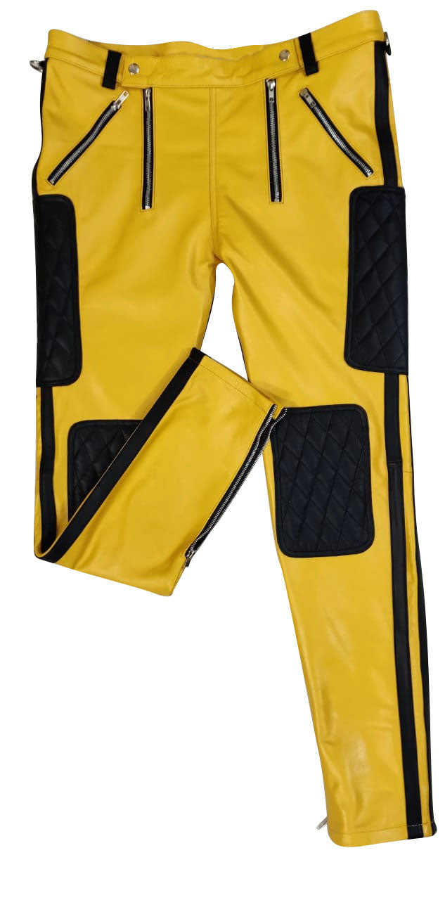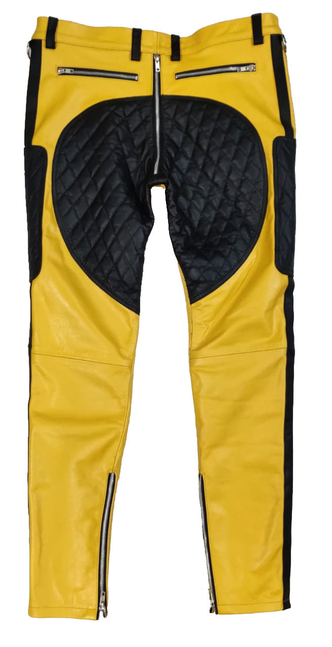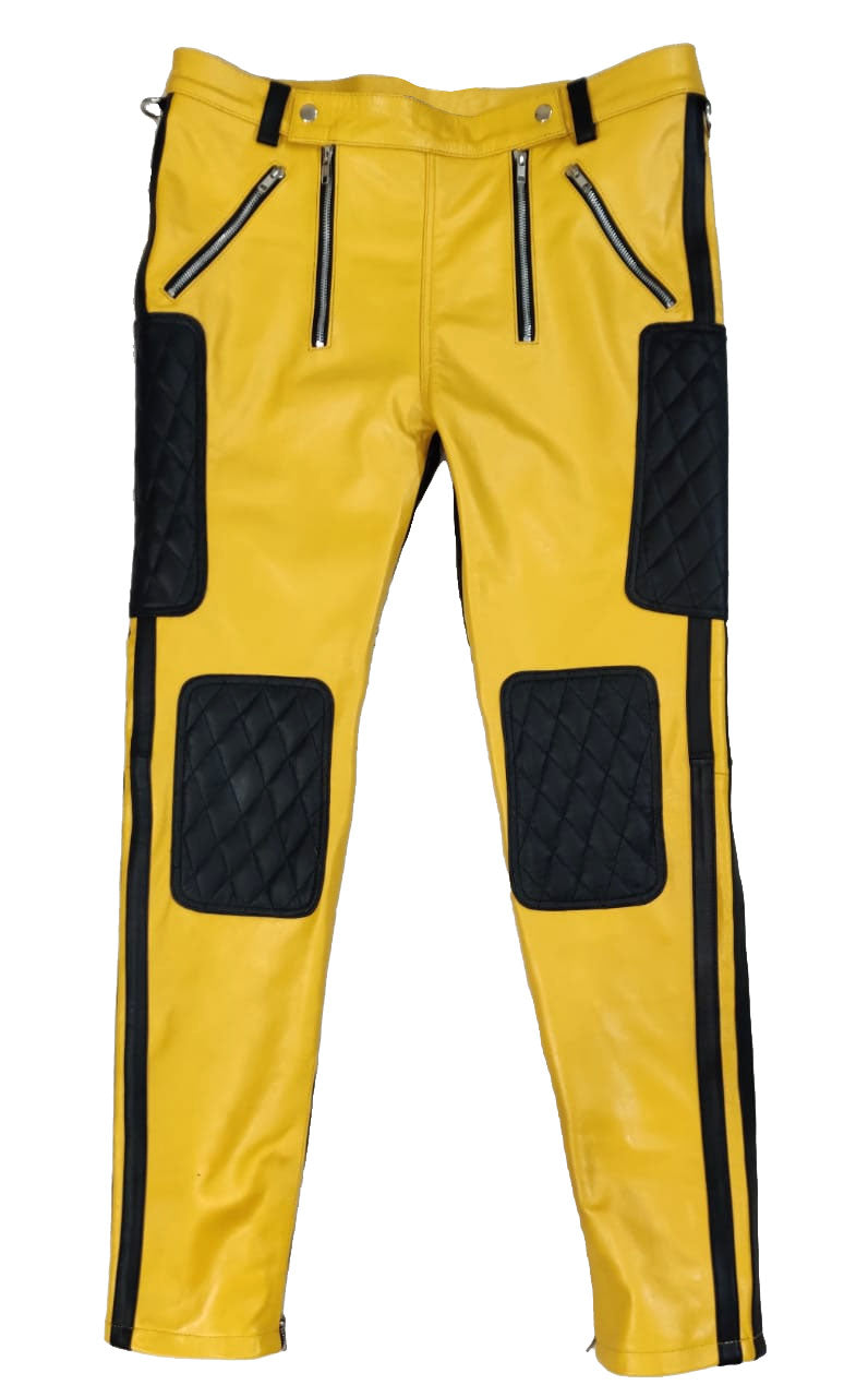 Men's Real Leather Quilted Panels Carpenter Pants Yellow & Black Panels Pants: