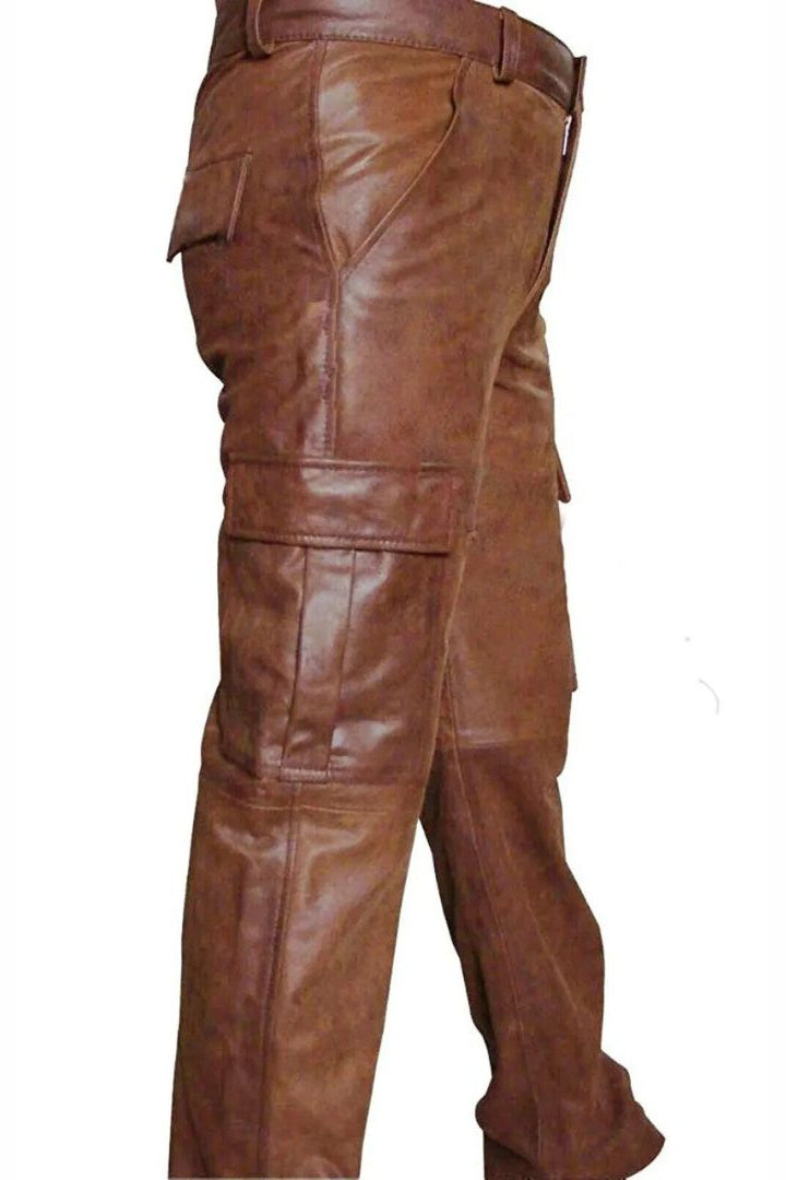 Men's Real Natural Grain Cowhide Vintage Leather Cargo Pants Bikers Pants