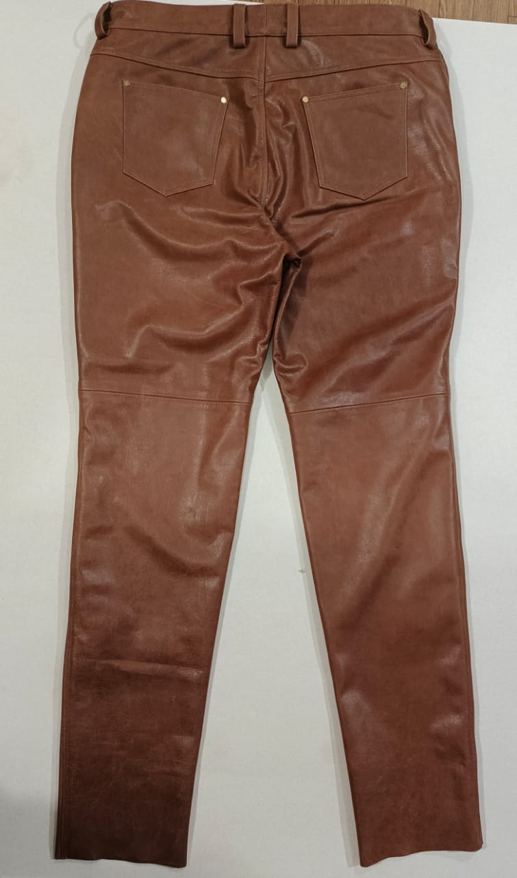Vintage Brown Natural Grain Cowhide Leather Pants with 5-Pocket Design