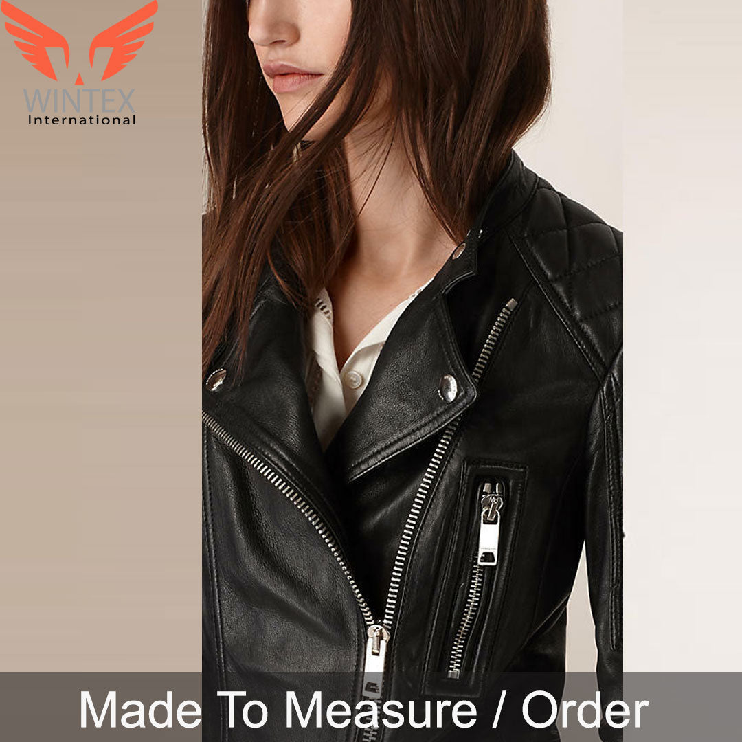 Women’s Real Lamb Leather Bikers Jacket Quilted Panels Leather Biker Jacket